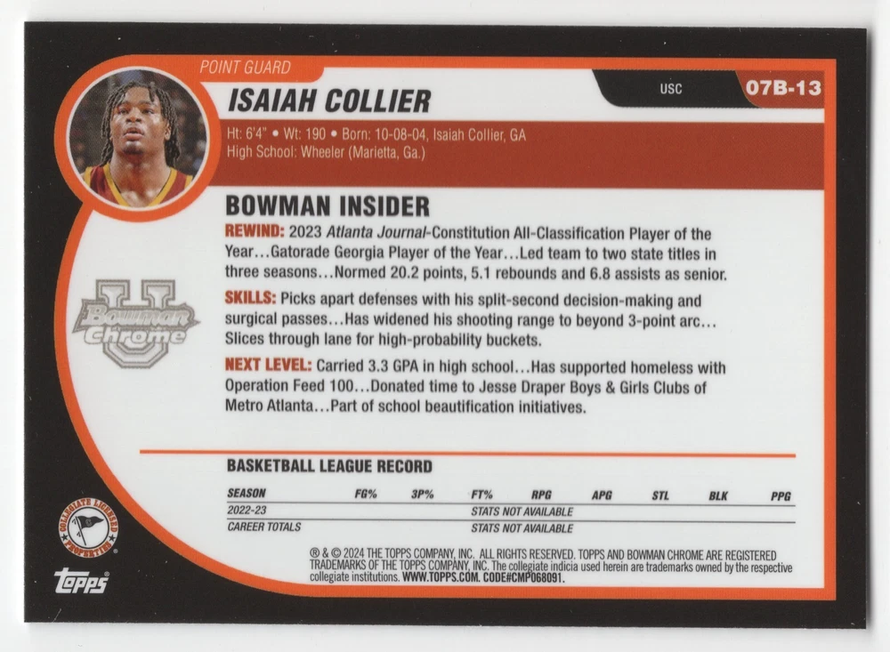 Season: 2023-24 Country/Region of Manufacture: United States Player/Athlete: Isaiah Collier Set: 2024 Topps Bowman Chrome U Language: English Card Number: 07B-13 Card Name: Refractor Vintage: No Autographed: No Features: Parallel/Variety, Rookie, Short Print Parallel/Variety: Refractor Manufacturer: Topps Original/Licensed Reprint: Original Team: USC Trojans Sport: Basketball Card Size: Standard Year Manufactured: 2024 Material: Card Stock Type: Sports Trading Card League: National Collegiate Athletic Association (NCAA)