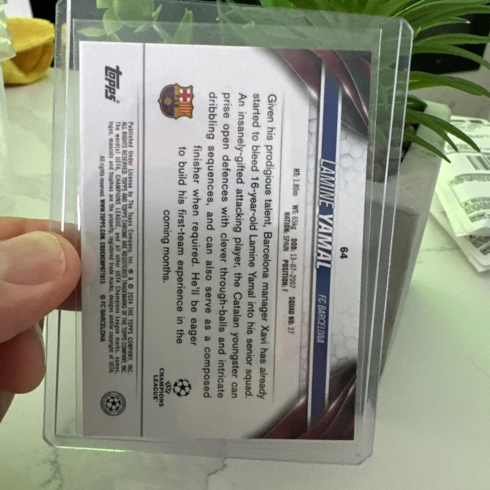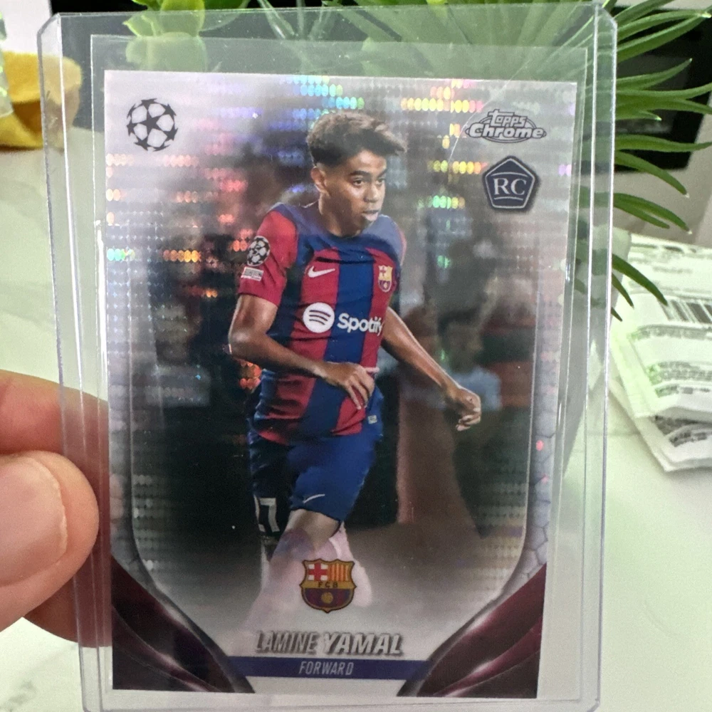 From the 2023-24 Topps Chrome UEFA Soccer collection comes the highly sought-after Lamine Yamal #64 RC Rookie Pulsar trading card. This sports trading card features the talented athlete in a chrome finish, perfect for any soccer fan or trading card collector. Add this rare and exclusive card to your collection and showcase your support for Yamal's promising career in the upcoming 2023-24 season.