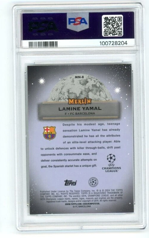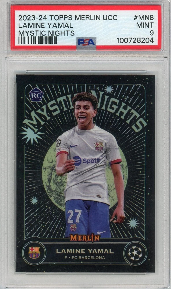 This is a Lamine Yamal 2023-24 Topps Merlin Mystic Nights Rookie Insert trading card. It features the soccer player in his rookie year and is part of the Topps set. The card is perfect for collectors who appreciate sports trading cards and want to add a piece of their favorite player's collection. The card is in excellent shape and is a must-have for any fan of Lamine Yamal or soccer in general.