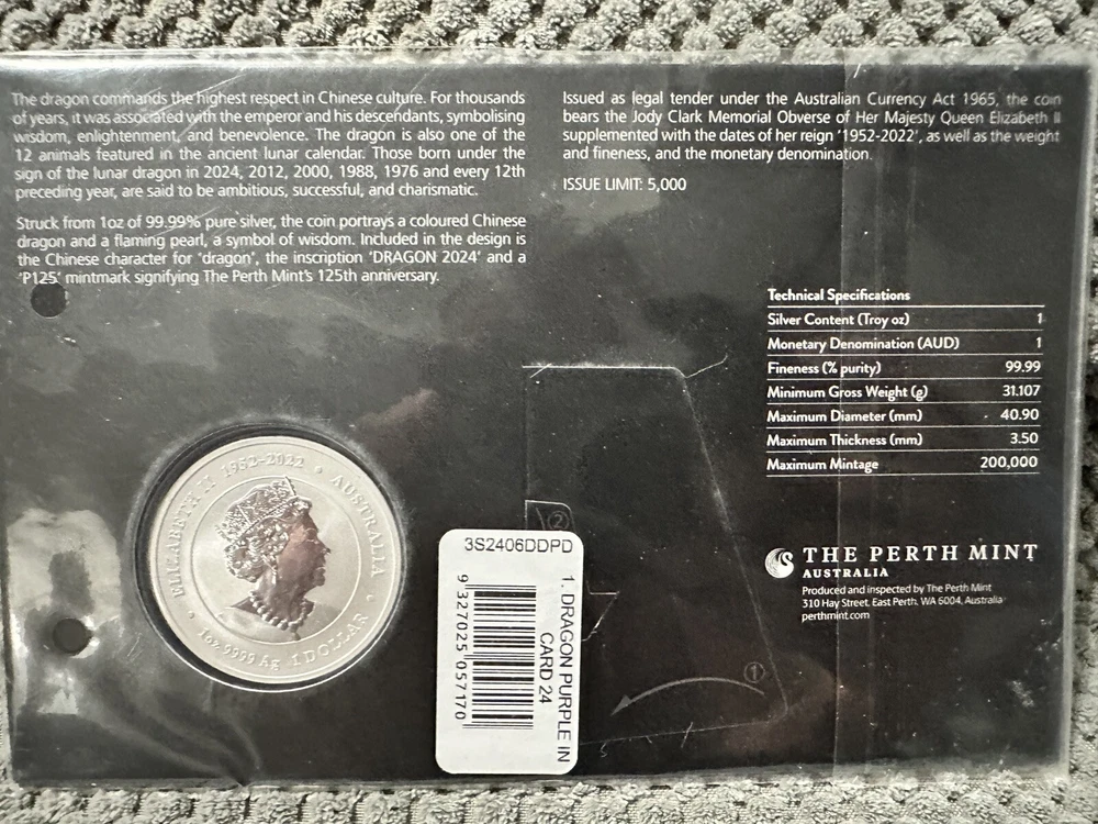 Year:2024Composition:SilverBarcode:9327025057170Precious Metal Content per Unit:1 ozCountry/Region of Manufacture:AustraliaCertification:the Perth Mint (in Card)Grade:UngradedCoin:Year of the DragonCertification Number:n/a (coin in mint card)Brand:The Perth MintItem Code:3S2406DDPDFineness:0.9999Brand/Mint:The Perth MintTotal Precious Metal Content:1 oz SilverStrike Type:Business