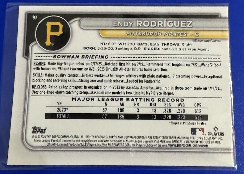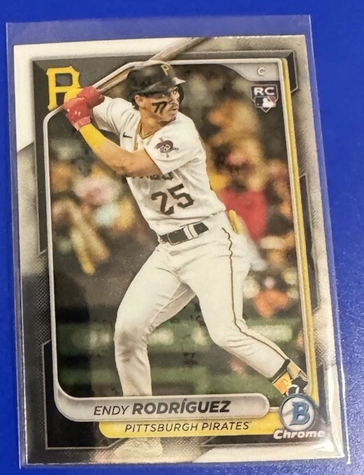 This 2024 Bowman baseball trading card features Endy Rodriguez of the Pittsburgh Pirates. With a chrome finish and a limited edition design, this card is a must-have for any collector. It is part of the Base Set and is an exclusive Rookie card, making it a highly sought after item. The card is framed and has a hologram for authenticity. It is a Standard size card and was manufactured by Bowman in the United States. This card is not autographed and is a 1st Edition, with all the features of a collectors edition. Don't miss your chance to add this rare and valuable card to your collection.