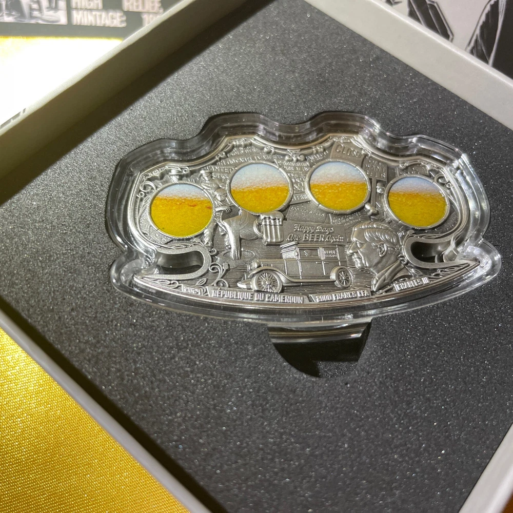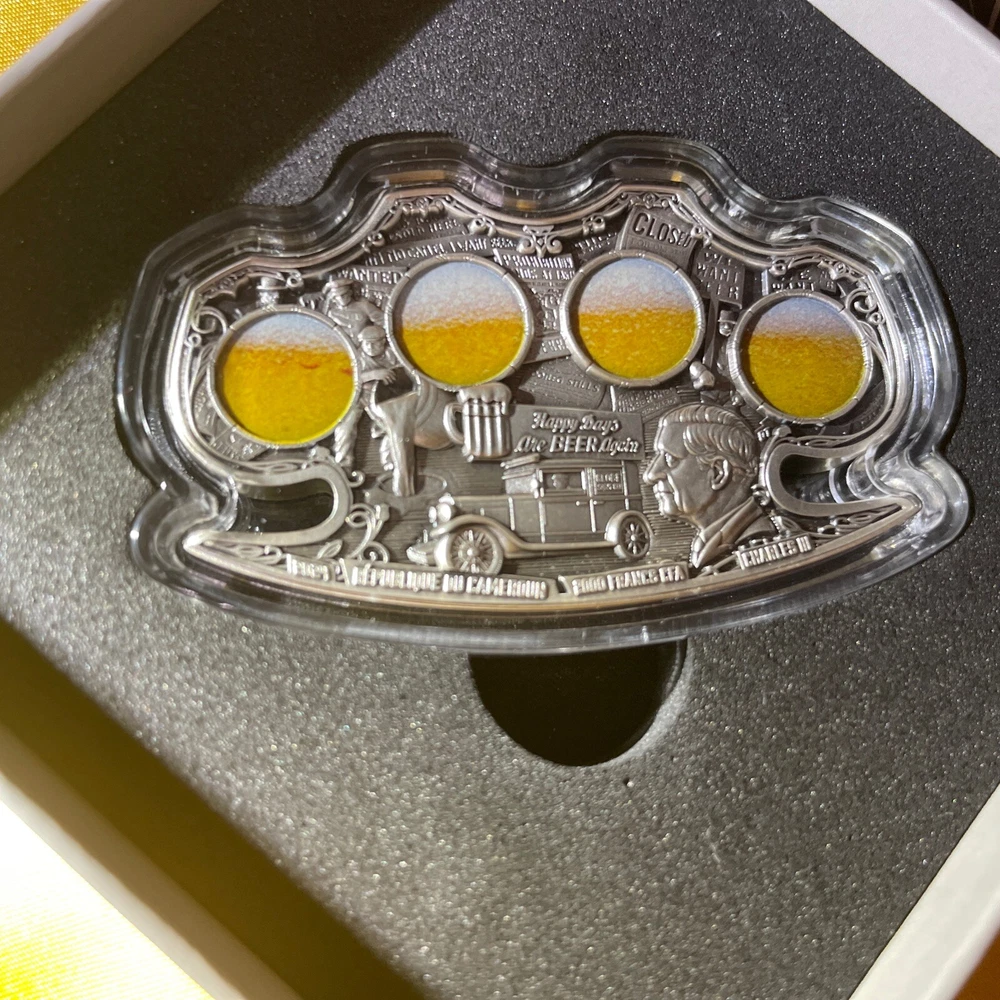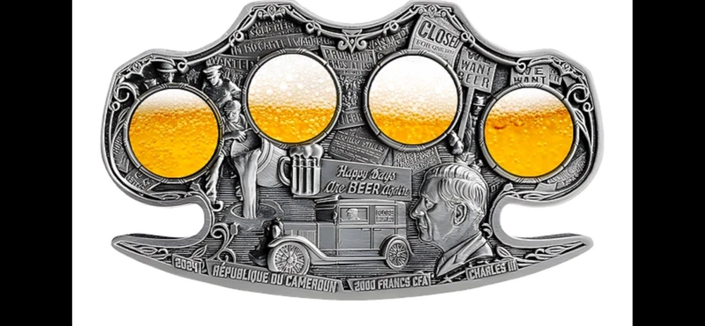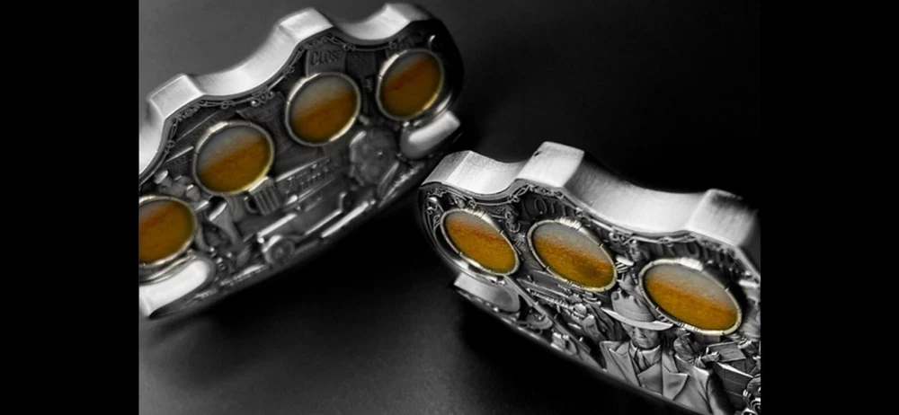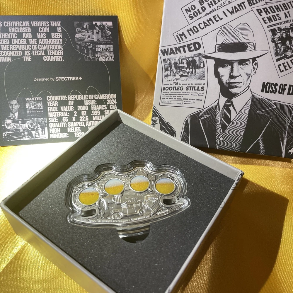 This rare and highly sought-after 2024 Cameroon Kiss of Death 2 oz Silver Antiqued Colorized Coin is a must-have for any serious coin collector. Crafted with 0.999 fineness silver and featuring an antique finish, this ungraded coin is certified uncirculated and comes with a COA #44 ! The coin is part of the Gangster Prohibition era and features the iconic Kiss of Death design (Silver) Brass Knuckles With a total precious metal content of 1oz silver, this coin is a true gem that is sure to impress. Don't miss out on your chance to add this unique piece to your collection. Very Well crafted coin and amazing artistry all the gangsters out with there Tommy Guns and brass knuckles for upclose greetings😎🤣👍💫