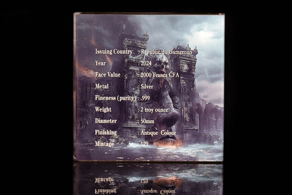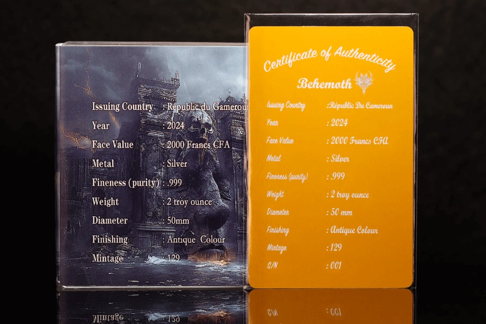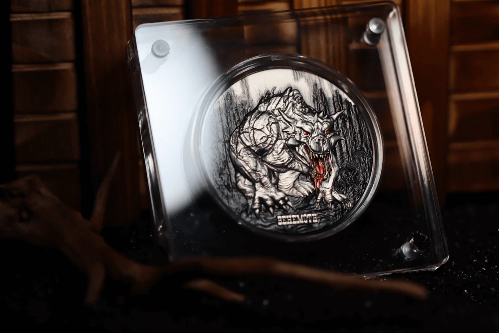 FREE SHIPPING ON DOMESTIC ORDERS New releases Deals Exclusives Bullion Gold Graded Licensed Standing behind our products & our name for over a century SINCE 1915 SHOP BY CATEGORY Animal Theme Art Coins Coin Sets Comics, Notes, & Foils Deals Famous Figures & Landmarks Gold Coins GR Reserve Exclusives Graded Coins Holiday Theme Licensed Products Lunar Calendar Nature Coins Premium Bullion Rare Certificate Numbers Shaped Coins Warriors & Gods Other PARTNERS & AFFILIATIONS STORE NEWSLETTER Add us to your Favorites and receive exclusive emails about new items and special promotions! Sign up 2024 Cameroon Majestic Behemoth 2 oz Silver Antiqued Colorized Coin Product Description Unveil the Majestic Behemoth: A Numismatic Marvel Enter the captivating world of ancient lore as we unveil the majestic saga of the Behemoth—a creature steeped in unparalleled power and shrouded in the mists of time. From the primordial chaos, this titan of beasts emerged, a guardian of the unknown, traversing epochs long past, leaving behind a legacy of awe and fascination. Envision its towering figure, a silhouette commanding the horizon, with sinewy muscles rippling beneath an obsidian hide that has witnessed the passage of untold ages. Its gaze, like smoldering embers, pierces through the darkness, ensnaring mortals with a presence both fearsome and enchanting.The Behemoth, a symphony of primal strength and unfathomable knowledge, emerges from the abyss, an eternal sentinel of mysteries waiting to be unraveled. Yet, its significance transcends mere physical dominance. Revered by ancients as the guardian at the Gate of Hell, the Behemoth stands as a sentinel between mortal realms and the shadowy abyss. With each thunderous step, it fortifies the barrier between worlds, safeguarding the secrets of the underworld from the prying eyes of humanity. But amidst tales of darkness, whispers of an ancient spirit echo within the Behemoth's story—a spirit yearning for balance amidst the chaos of existence. Someday it was destined by prophecy to sway the cosmic dance of creation and destruction, adding to its mystique and allure. Across epochs, the Behemoth's legend reverberates through the corridors of time,captivating hearts and minds with its enduring tale. In the whispers of the wind and the depths of the earth, its presence lingers—a reminder of the unfathomable mysteries lying beyond mortal comprehension. Now, immortalized in numismatic splendor, the Behemoth's tale continues its journey.Behold the coin in your hands, a testament to its enduring legacy—a legacy inviting you to become a custodian of its timeless narrative. With only 129 pieces for the antique version, each meticulously crafted coin bears vibrant colors that breathe life into the mythos of the Behemoth. Yet, this coin transcends mere collectible status; it serves as a portal to a realm where reality and imagination intertwine. With each glance, immerse yourself in a world where legends spring to life, and the boundaries of myth and truth blur.Embrace the power of the Behemoth and embark on a journey through the annals of myth and legend, where the mysteries of the universe await those bold enough to seek them. Contact Shipping Payment Returns To contact our Customer Service Team, simply click the button here and our Customer Service team will be happy to assist. Domestic Shipping Options - Free shipping USPS Ground Advantage UPS Ground Saver International Shipping Options – Calculated USPS Priority Mail International UPS Worldwide Expedited UPS Worldwide Saver UPS Standard to Canada Handling time Will ship within 1 business day of receiving cleared payment. Ship From Location Attleboro, Massachusetts, 02703, United States Note to international buyers The item price and shipping charges do not include import duties, import taxes, and customs clearance fees. These charges are the buyer's responsibility. Please check with your local customs office to determine what these additional charges may be prior to bidding or purchasing an item. If your order is returned to GR Reserve due to your refusal to pay duties or taxes, or if the carrier (for example, Federal Express or UPS) was unable to deliver your order, you agree you are responsible for any return shipping fees, additional duties, or applicable taxes for returning the package back to GR Reserve. In addition, if your package is returned to GR Reserve, we will not reship your order unless and until we are paid in full for any return shipping costs, duties, taxes we have had to pay or advance for you as well as any subsequent re-ship fees back to you. Immediate payment is required upon selecting "Buy It Now" or upon checking out through the cart. We accept payment via U.S. PayPal accounts and all Major Credit Cards, Debit Cards & Google Pay. We are legally required to collect sales tax in those states and localities where we maintain a physical presence. The applicable amount of sales tax charged to an order will be calculated based on the shipment destination's state and local sales tax laws. Thank you for shopping with us on eBay! Standard Other eBay Mastercard® Earn up to 5x points when you use your eBay Mastercard®. Learn more GR Reserve’s return, refund, and exchange policy is limited to (30) business days from the date that you received your item. If you find you have received a defective item, please contact us, and include detailed photos. GR Reserve will then assess whether the product is eligible for a return, refund, or exchange. For approved exchanges, you must follow all instructions provided by us, including packaging the product appropriately. We are responsible for the cost of return domestic shipping and the risk of loss during the return shipment. Refer to eBay Return policy for more details. You are covered by the eBay Money Back Guarantee if you receive an item that is not as described in the listing. Free Shipping On all domestic order 100% SATISFACTION GUARANTEED About Feedba