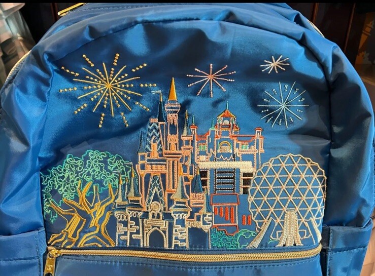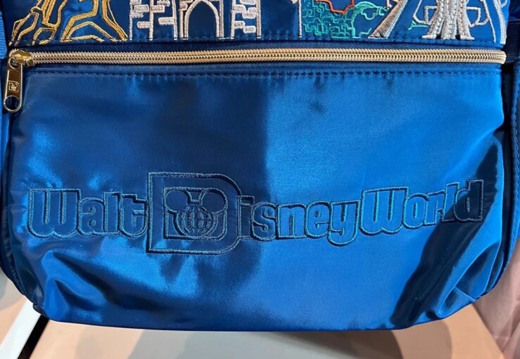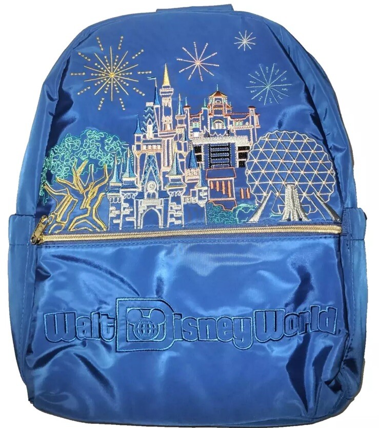The product is a 2024 Disney World Blue 4 Parks Icons Castle Epcot Embroidered 16" Backpack from the Disney brand. It features iconic Disney World symbols like the castle and Epcot, and is part of the 2024 4 Park Icon Collection event. This collectible item showcases characters and themes from Disney World Magic, Epcot, Mickey, AK, and Hollywood.