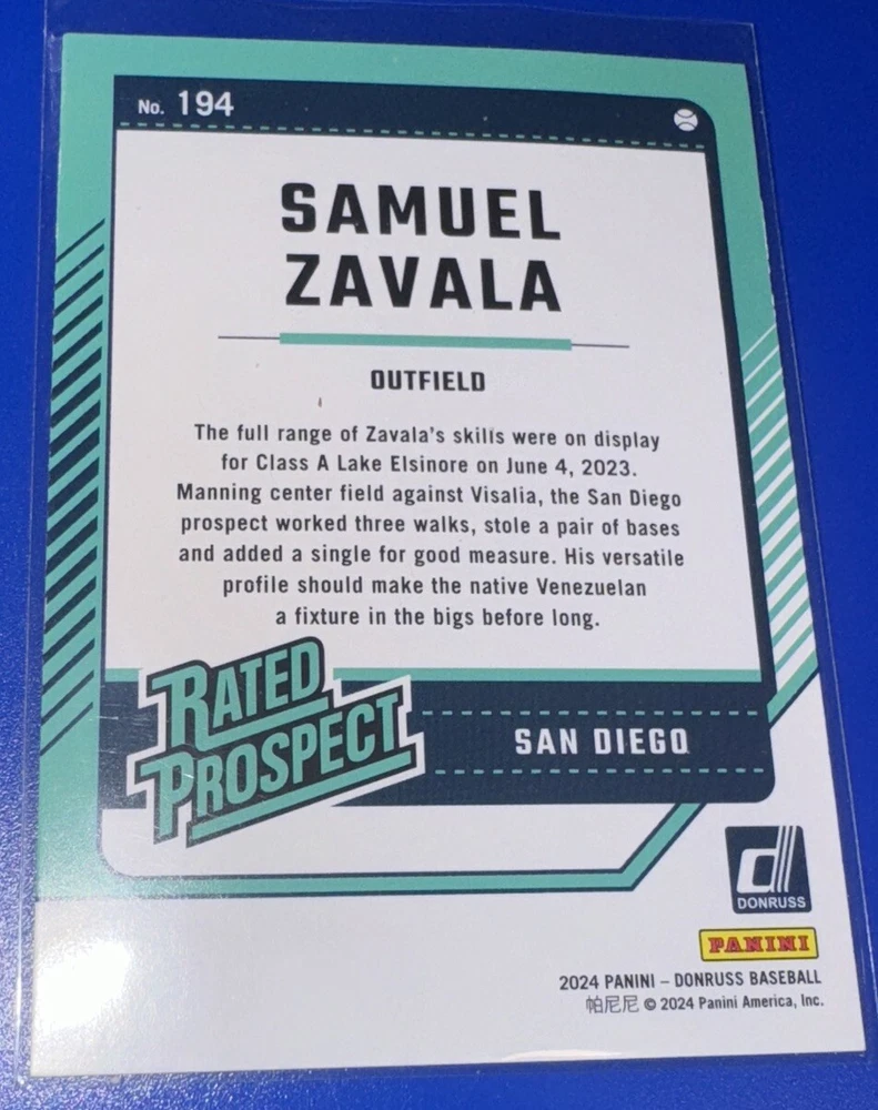 This 2024 Donruss Baseball trading card features Samuel Zavala of the San Diego Padres. The card is part of the Optic Blue Velocity insert set and is a limited edition, collectors item. It is a 35 pt. card stock with a hologram and framed design. The card is a base set, 1st edition, and is a short print with a parallel/variety. It is an exclusive rookie card and is perfect for any baseball fan or collector. The card was manufactured in the United States by Donruss and is an original, licensed reprint. This card is a must-have for anyone who wants to celebrate the MLB World Series in style.