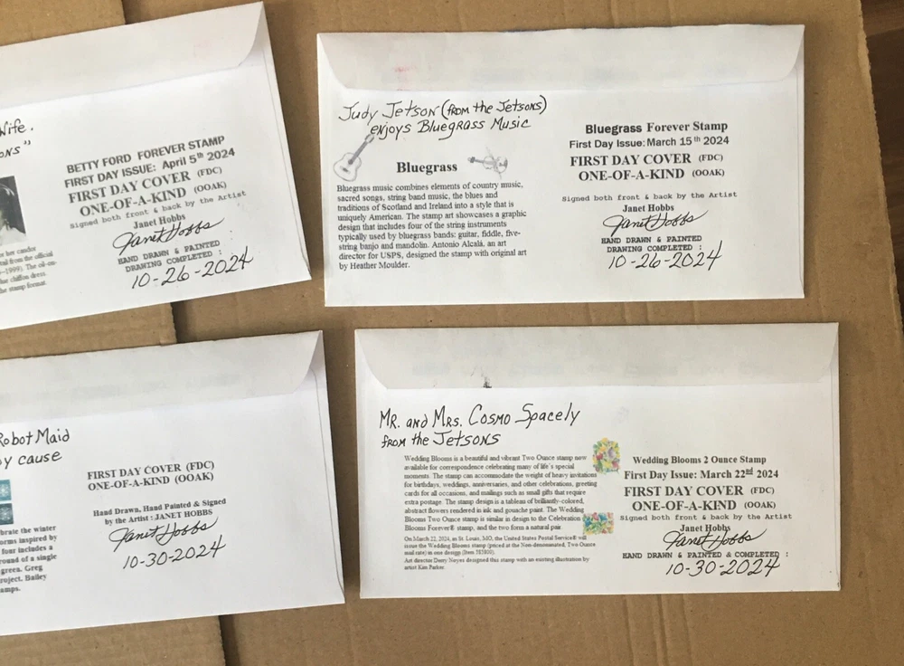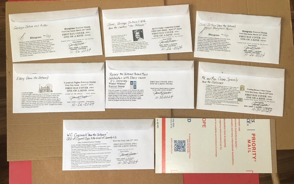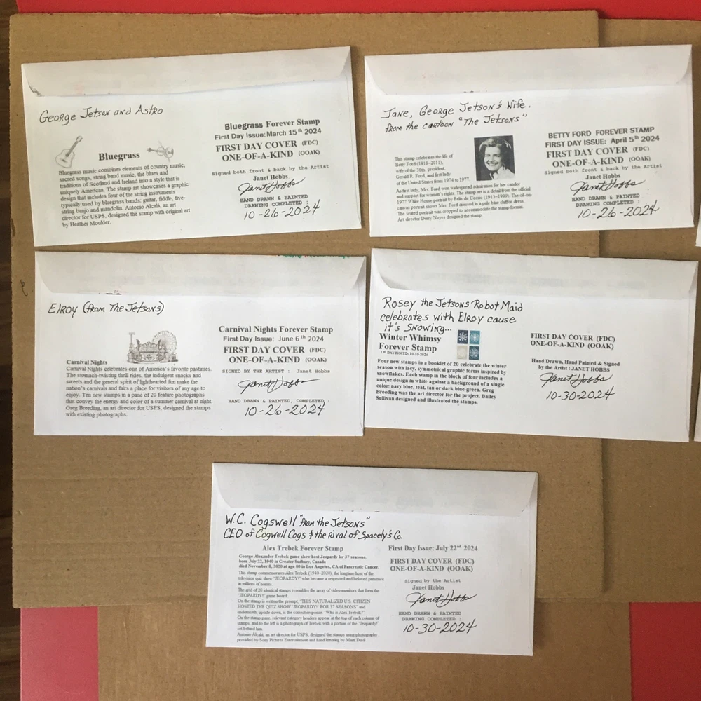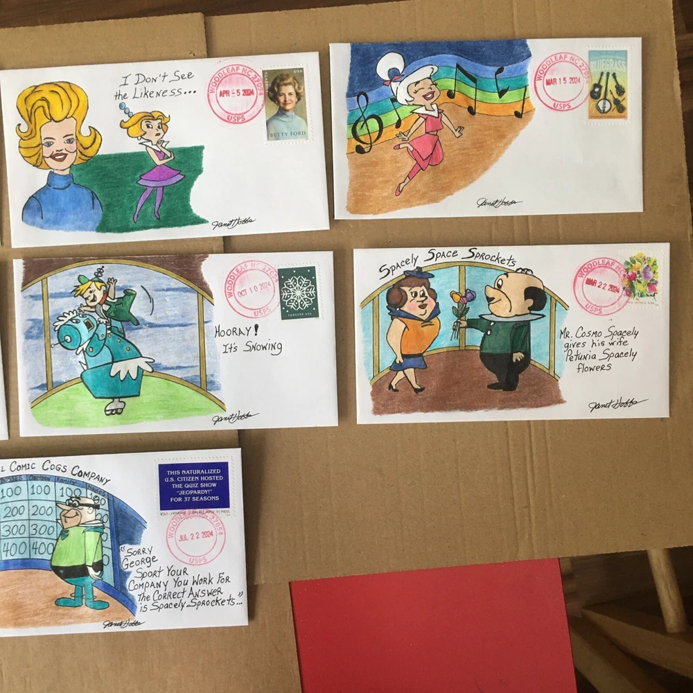 Set of Seven Cachets 2024 Forever Stamps All are Canceled on First Day Issed One of a Kind/ First Day Cover UO Cancel. You are bidding on the set of seven drawings of the Jetson Characters. Hand Drawn and Hand Painted By the Artist: Janet Hobbs Painted with Ink, Pencils, Pastels and Markers. Signed Front and Back by Artist. Janet Hobbs. Shipped USPS FIRST CLASS. Shipped within USA only . Thank You for viewing and Watch my Auctions for more Janet Hobbs Cachet, Used Stamps and Postal Deck Cards. Follow me Ms.GoodCentsCoins on eBay or Janet Hobbs Cachet.