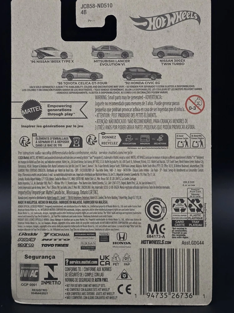 This rare and highly sought-after Hot Wheels car is a must-have for any diecast collector. The 2024 Mitsubishi Lancer Evolution VI is part of the 90's Street Scene series and is a special edition custom Otto model. With a limited production run, this car is a true gem that will appreciate in value over time. Featuring a vibrant yellow color and intricate detailing, this 1:64 scale model is made from high-quality diecast material and was manufactured in Malaysia. The car is recommended for adult collectors and is suitable for boys and girls. Add this unique piece to your collection today and relive the 90's street scene era.