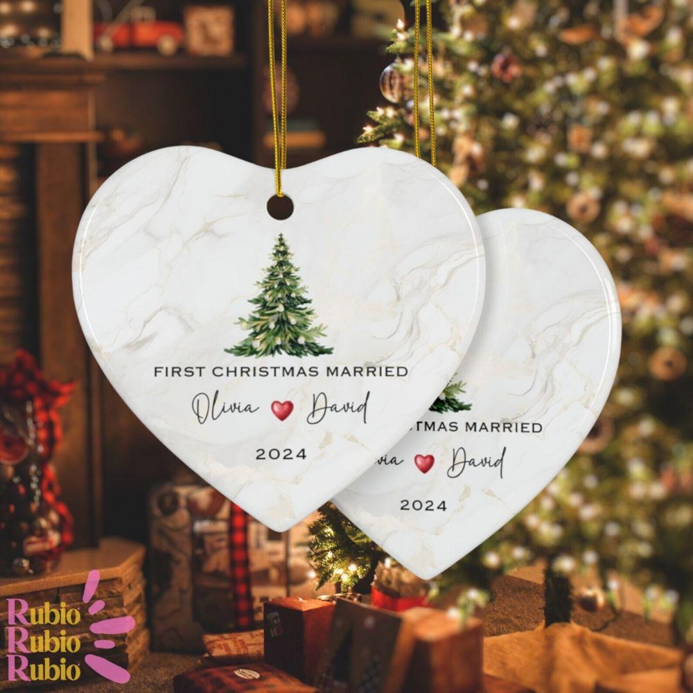 Ceramic Ornament First Christmas Married Ornament 2024 Mr Mrs Ornament Personalized Wedding Gift Newlywed Christmas Gift Our Material: Ceramic Color: White Shapes: Circle, star, heart and oval Can be printed on both sides Imprint full-color artwork, photos, or logos Hole for hanging string and hanging string included Printed in the USA