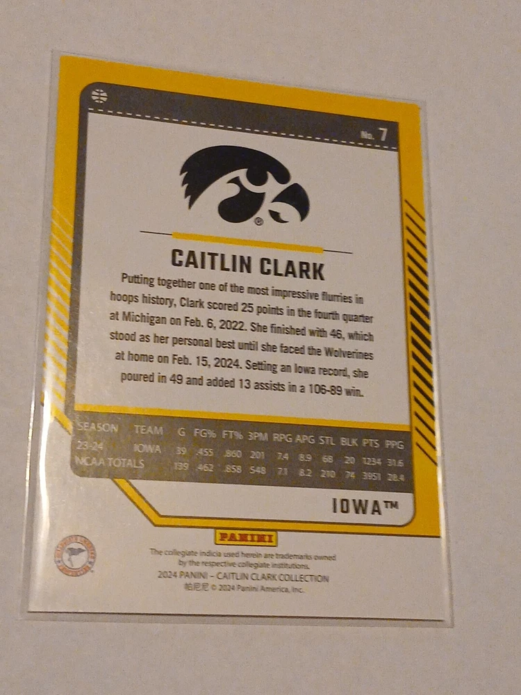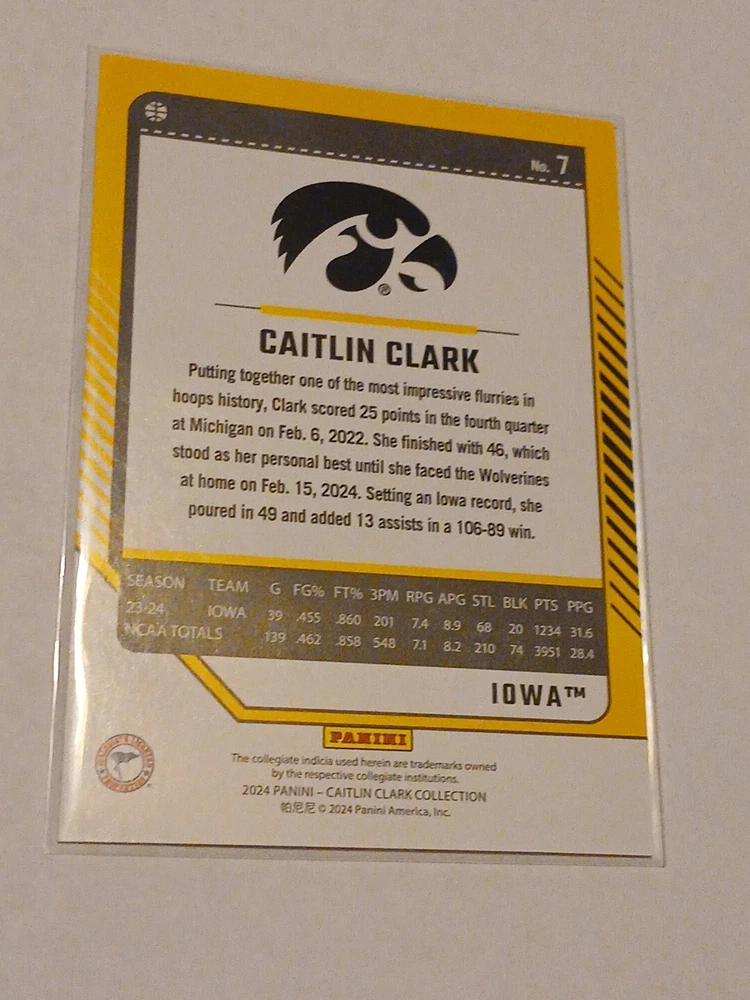 This 2024 Panini Caitlin Clark Collection sports trading card features the rookie basketball player, Caitlin Clark, with card number 7. The card is part of the Base Donruss insert set and is a must-have for any fan of the National Collegiate Athletic Association (NCAA). The card is manufactured by Panini and is a great addition to any sports trading card collection. The card has special features as an insert and is part of the 2024 season. It is perfect for collectors who are looking for a unique and rare card to add to their collection. This trading card is a great investment for any fan of Caitlin Clark or the NCAA.