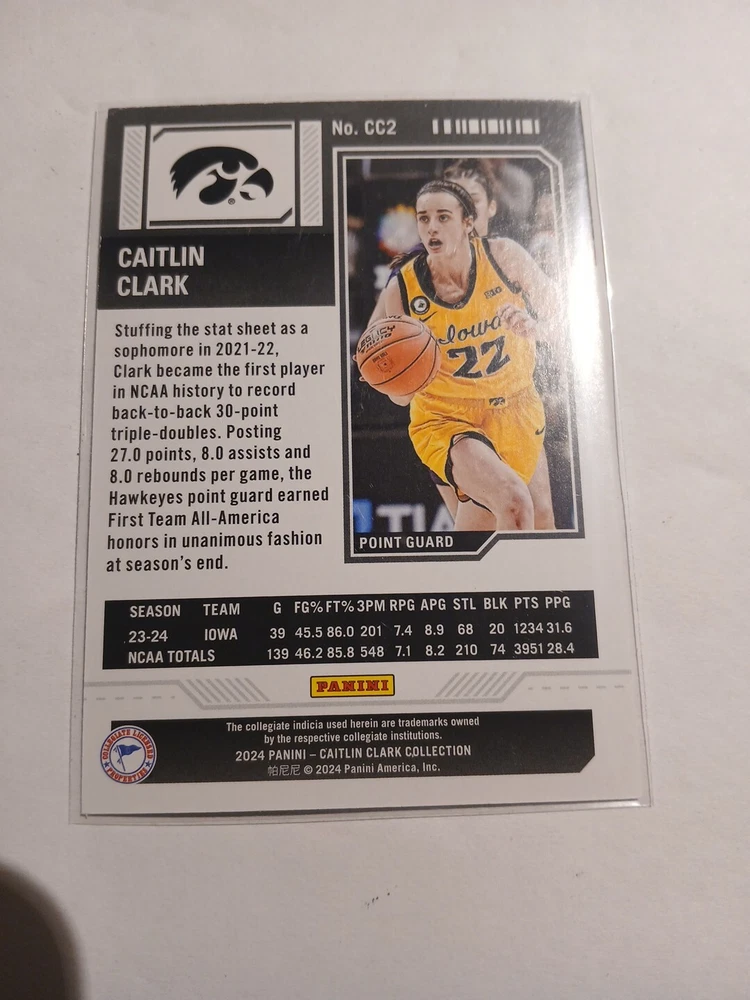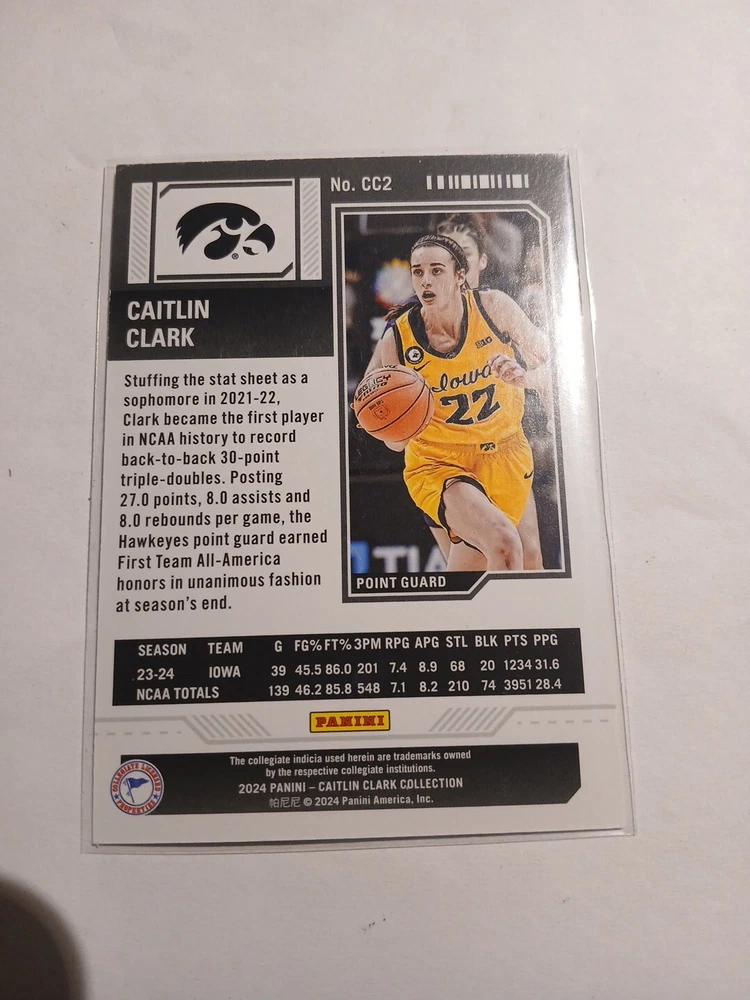 This 2024 Panini Caitlin Clark Collection sports trading card features the rookie and insert set, College Contenders, with card number CC2. The card showcases the basketball player, Caitlin Clark, who is part of the National Collegiate Athletic Association (NCAA) league. The card is manufactured by Panini and is a great addition to any sports trading card collection. The season for this card is 2024 and it falls under the category of Sports Mem, Cards & Fan Shop and Trading Card Singles.