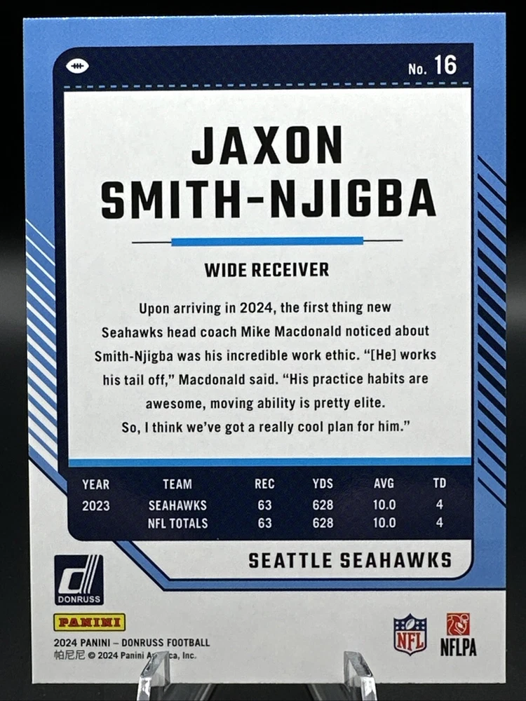 This 2024 Panini Donruss Green Press Proof card features Jaxon Smith-Njigba, player for the Seattle Seahawks in the National Football League. The card is made of high-quality card stock and is an original, licensed product. It is a standard size trading card with a unique press proof green parallel variety. This sports trading card is a great addition to any collection and is perfect for fans of Jaxon Smith-Njigba or the Seattle Seahawks. It is an English language card manufactured by Panini in the United States and features the card number 16. The card is not autographed and is not a vintage or reprinted item.