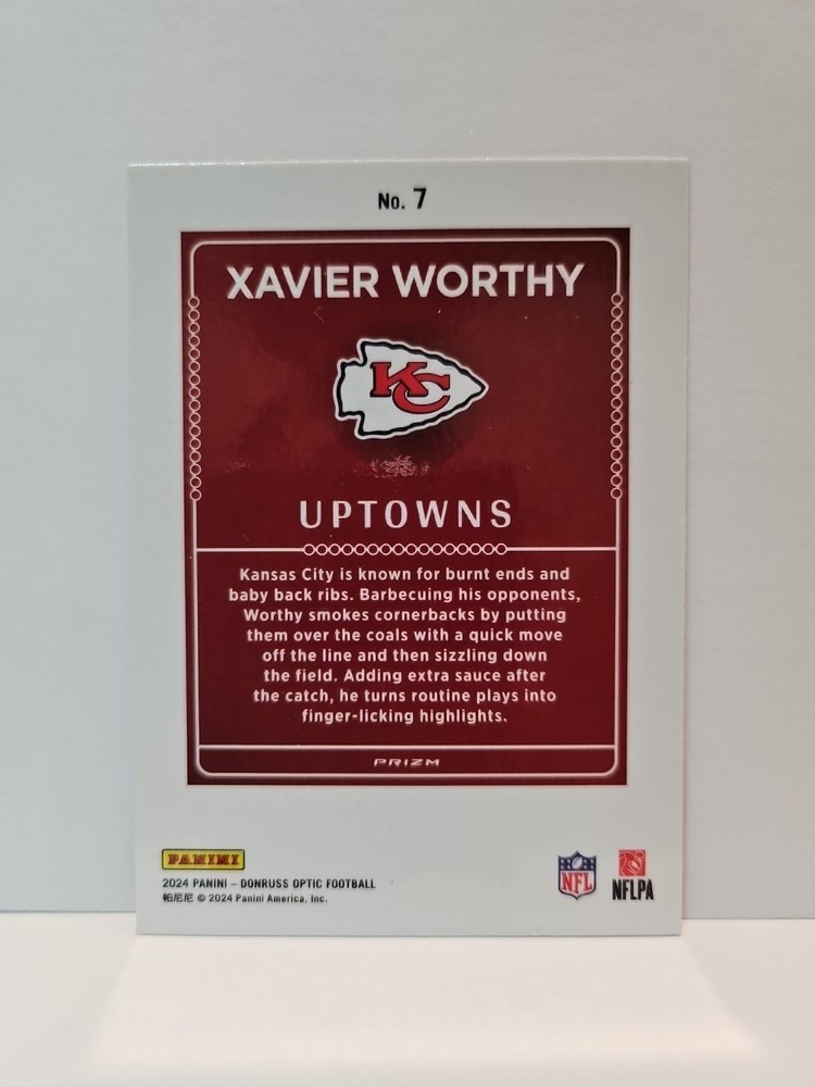 The 2024 Panini Donruss Optic Uptowns Xavier Worthy #7 trading card is a highly sought-after collectible for fans of the Kansas City Chiefs and football enthusiasts. This rookie card from the Uptowns insert set features a unique design and is a valuable addition to any sports trading card collection. Manufactured by Panini, this card showcases the potential of a rising star in the National Football League, making it a must-have for collectors and fans alike.