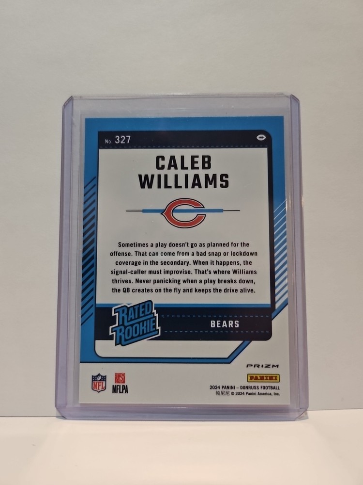 The 2024 Panini Donruss Rated Rookie Caleb Williams #327 Optic Preview Red Wave trading card is a highly sought-after collectible featuring the up-and-coming football star Caleb Williams. This limited edition card is part of the Optic Preview Red Wave Prizm set, adding a unique and eye-catching design to any sports card collection. As a rookie card from the National Football League (NFL) with the Chicago Bears, this card captures a pivotal moment in Caleb Williams' early career and is a must-have for football card enthusiasts and fans of the sport.