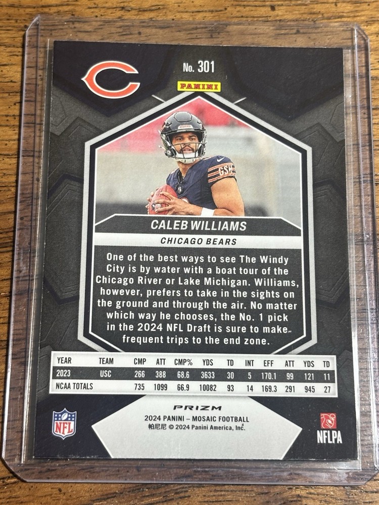 The product is a 2024 Panini Mosaic Caleb Williams #301 Silver Prizm Rookie trading card featuring the player in his Chicago Bears uniform. This sports trading card is part of the National Football League (NFL) set by Panini, highlighting the rookie athlete in a special silver prizm parallel variety. As a part of the base set, this card captures the excitement of the 2024 football season, making it a valuable collectible for fans and collectors alike.