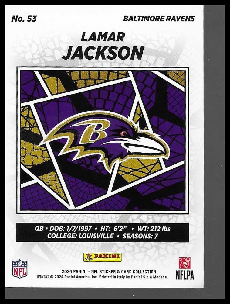 Up for sale is a 2024 Panini NFL Sticker & Card Collection #53 Lamar Jackson Card. This ungraded card features Jackson, superstar quarterback for the Baltimore Ravens, in the base card design from the 2024 Sticker & Card Collection release. • Card Number: #53 • Subset: Base Card (Cards) • Team: Baltimore Ravens • Condition: Near Mint or better (ungraded) • Attributes: Veteran card, standard base Perfect addition for Ravens fans, Lamar Jackson collectors, or anyone building the 2024 Sticker & Card Collection set. Check out our other listings for more rookies, veterans, inserts, and foils. Track Page Views With Auctiva's Counter