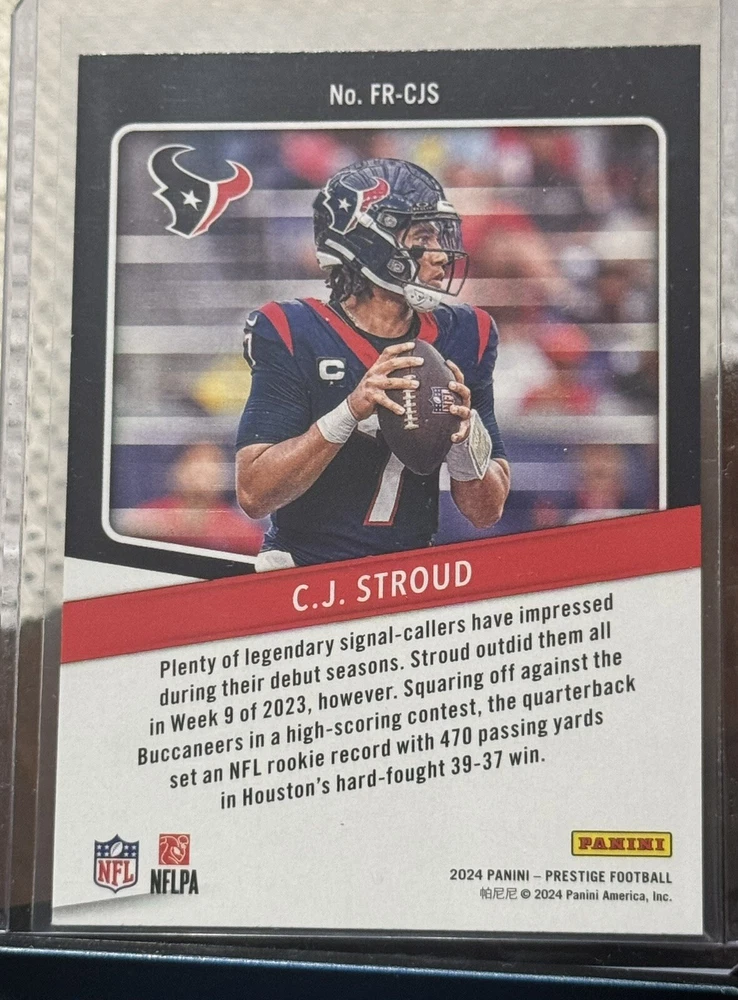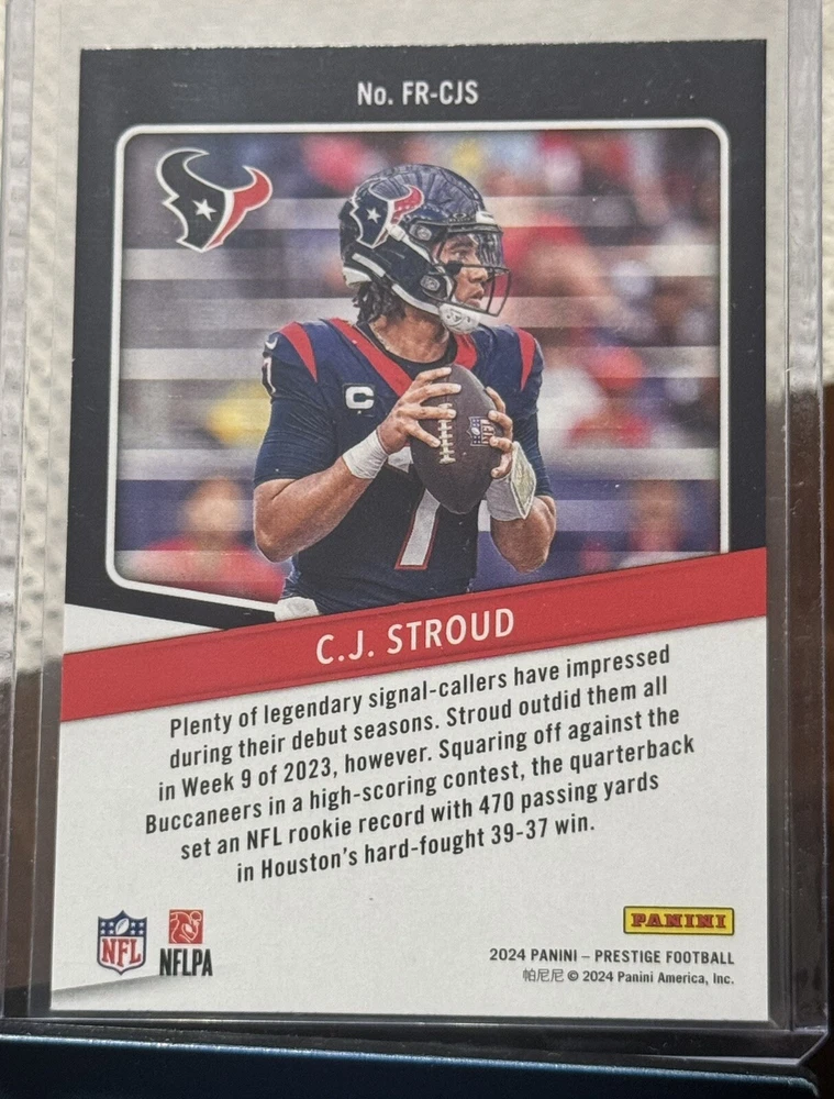 This 2024 Panini Prestige trading card features C.J. Stroud of the Houston Texans, with the card number FR-CJS. It is an insert card from the For The Record set, and is perfect for any National Football League (NFL) football fan. The card is manufactured by Panini and is a sports trading card type. The card is in excellent shape, with a card number of 4000 and a manufacturer code of 4000. It is a great addition to any sports trading card collection and is sure to impress. Don't miss out on the opportunity to own this fantastic card.