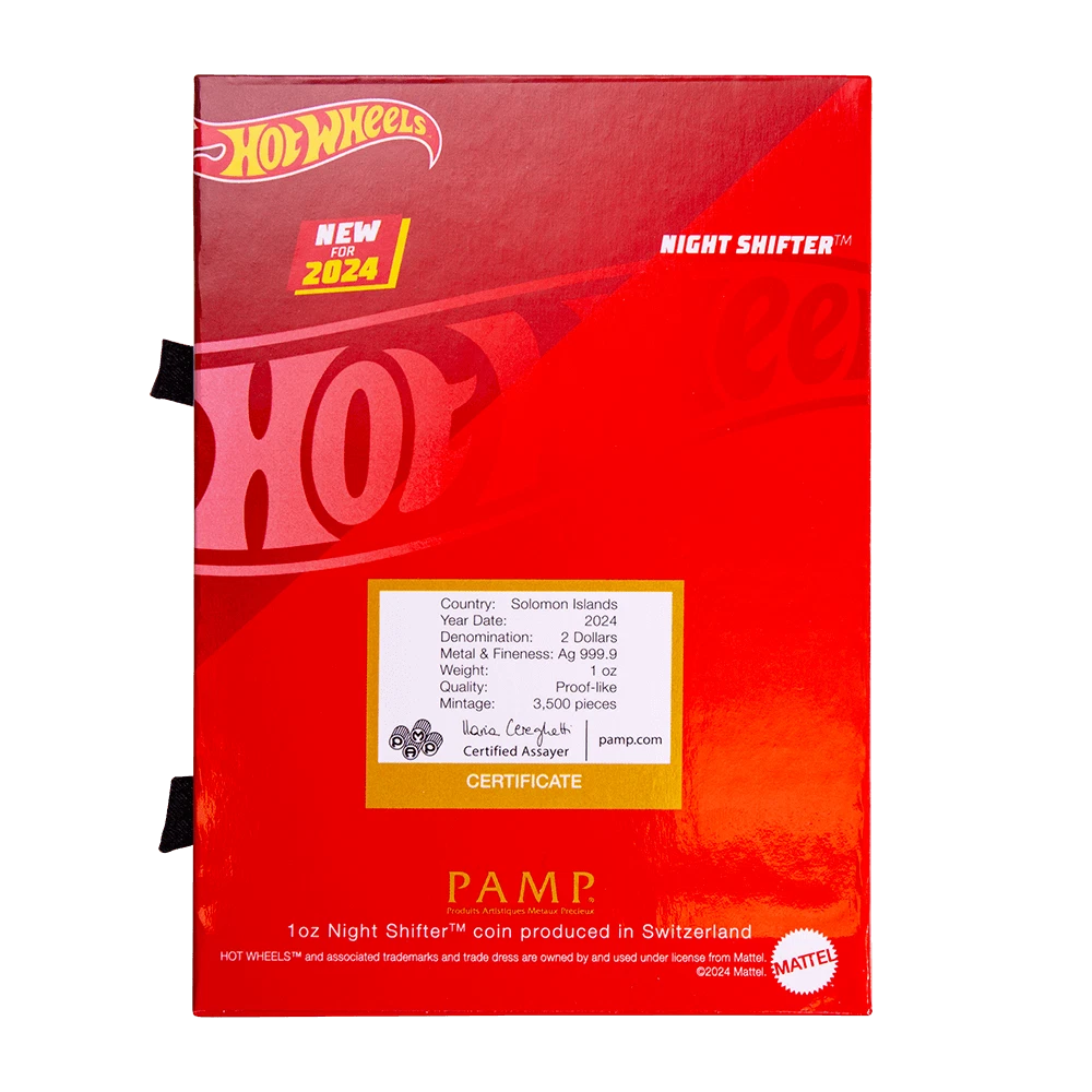 FREE SHIPPING ON DOMESTIC ORDERS New releases Deals Exclusives Bullion Gold Graded Licensed Standing behind our products & our name for over a century SINCE 1915 SHOP BY CATEGORY Animal Theme Art Coins Coin Sets Comics, Notes, & Foils Deals Famous Figures & Landmarks Gold Coins GR Reserve Exclusives Graded Coins Holiday Theme Licensed Products Lunar Calendar Nature Coins Premium Bullion Rare Certificate Numbers Shaped Coins Warriors & Gods Other PARTNERS & AFFILIATIONS STORE NEWSLETTER Add us to your Favorites and receive exclusive emails about new items and special promotions! Sign up 2024 Solomon Islands Hot Wheels Night Shifter Mystery Box 1oz Silver Coin Product Description An original Hot Wheels™ design, the Night Shifter™ was inspired by the mechanical and sheer raw characteristics of high-performance race cars. The Night Shifter™ is kitted out with twin turbo-chargers and double fuel tanks fabricated from military aircraft. The Night Shifter™ is featured on an engraved 1oz pure silver legal tender coin with glossy holiday colors. Each box comes with one of four special souvenir pins of other “OG” Hot Wheels™ cars. Which one will you get?! Officially licensed Hot Wheels™ holiday edition of the Night Shifter™ as a shaped legal tender coin! Colorized with texture and a glossy finish! Individually serialized and housed within a custom capsule Comes with one of four officially licensed Hot Wheels™ souvenir pins! All previous Hot Wheels™ coin issues SOLD OUT! Contact Shipping Payment Returns To contact our Customer Service Team, simply click the button here and our Customer Service team will be happy to assist. Domestic Shipping Options - Free shipping USPS Ground Advantage UPS Ground Saver International Shipping Options – Calculated USPS Priority Mail International UPS Worldwide Expedited UPS Worldwide Saver UPS Standard to Canada Handling time Will ship within 1 business day of receiving cleared payment. Ship From Location Attleboro, Massachusetts, 02703, United States Note to international buyers The item price and shipping charges do not include import duties, import taxes, and customs clearance fees. These charges are the buyer's responsibility. Please check with your local customs office to determine what these additional charges may be prior to bidding or purchasing an item. If your order is returned to GR Reserve due to your refusal to pay duties or taxes, or if the carrier (for example, Federal Express or UPS) was unable to deliver your order, you agree you are responsible for any return shipping fees, additional duties, or applicable taxes for returning the package back to GR Reserve. In addition, if your package is returned to GR Reserve, we will not reship your order unless and until we are paid in full for any return shipping costs, duties, taxes we have had to pay or advance for you as well as any subsequent re-ship fees back to you. Immediate payment is required upon selecting "Buy It Now" or upon checking out through the cart. We accept payment via U.S. PayPal accounts and all Major Credit Cards, Debit Cards & Google Pay. We are legally required to collect sales tax in those states and localities where we maintain a physical presence. The applicable amount of sales tax charged to an order will be calculated based on the shipment destination's state and local sales tax laws. Thank you for shopping with us on eBay! Standard Other eBay Mastercard® Earn up to 5x points when you use your eBay Mastercard®. Learn more GR Reserve’s return, refund, and exchange policy is limited to (30) business days from the date that you received your item. If you find you have received a defective item, please contact us, and include detailed photos. GR Reserve will then assess whether the product is eligible for a return, refund, or exchange. For approved exchanges, you must follow all instructions provided by us, including packaging the product appropriately. We are responsible for the cost of return domestic shipping and the risk of loss during the return shipment. Refer to eBay Return policy for more details. You are covered by the eBay Money Back Guarantee if you receive an item that is not as described in the listing. Free Shipping On all domestic order 100% SATISFACTION GUARANTEED About Feedback GR Reserve - Attleboro, MA 02703