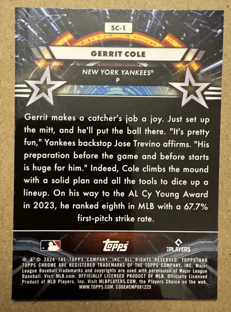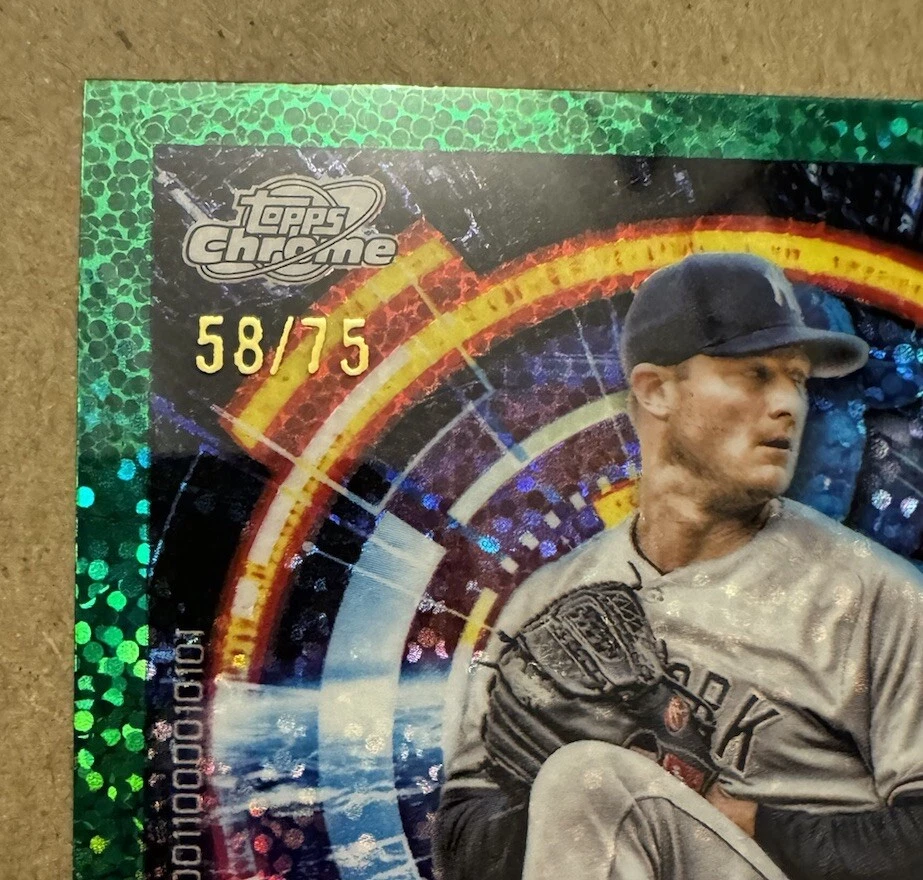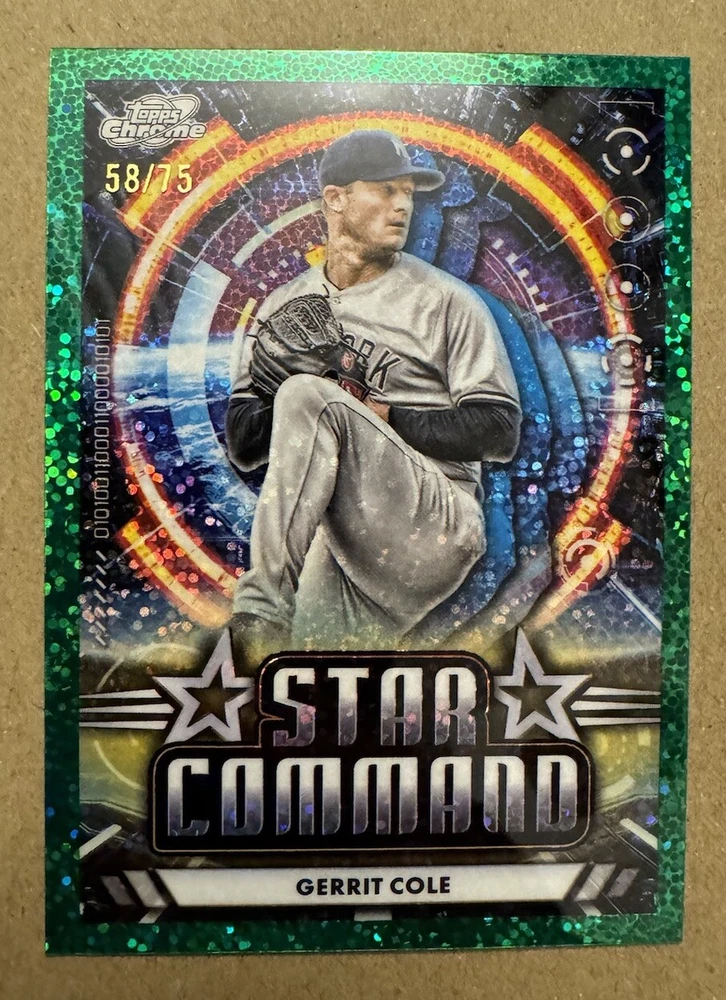 This card features a green refractor parallel, serial numbered 58/75 of New York Yankees all star pitcher Gerrit Cole. The card is from 2024 Topps Chrome Cosmic and is a Star Command insert. The card is pack fresh and will be shipped via USPS first class mail in a PWE, top loader and cardboard protection.