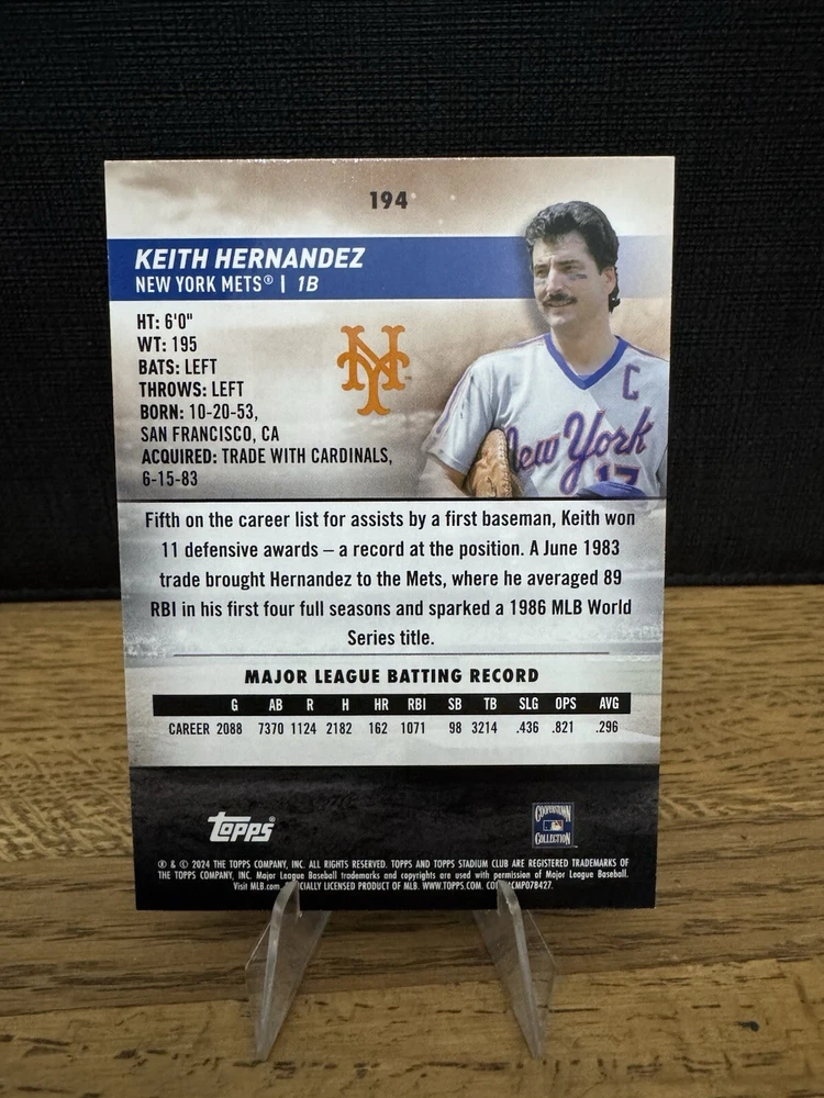 This is a rare and highly sought-after 2024 Topps Stadium Club trading card featuring baseball legend Keith Hernandez. The card is a First Day Issue variety and comes from the original, licensed reprint set manufactured by Topps. It is made of sturdy 35 Pt. card stock and has a standard size. The card showcases the New York Mets player in his iconic team uniform and includes his card number 85. The card is perfect for collectors and fans of the Major League Baseball. It is a great addition to any sports trading card collection and is sure to impress. Don't miss your chance to own this rare piece of sports memorabilia.