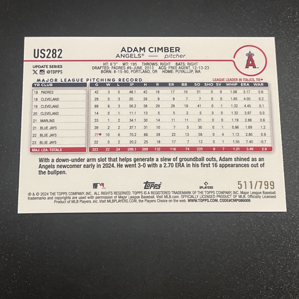 Features: Serial Numbered, Base Set, Parallel/Variety Team: Los Angeles Angels Manufacturer: Topps Card Number: US282 Season: 2024 Type: Sports Trading Card League: Major League Baseball (MLB) Set: 2024 Topps Update Series Parallel/Variety: Purple Holo Foilboard Player/Athlete: Adam Cimber Sport: Baseball Print Run: 799