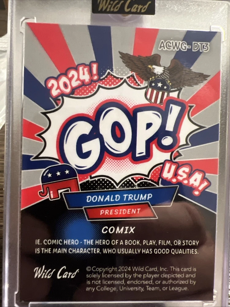 This rare 2024 Wild Card Alumination Donald Trump GOP trading card is a must-have for any collector or fan of the former president. With a stunning design and high-quality printing, this card is sure to be a standout in any collection. Featuring the iconic Wild Card and US Presidents franchises, this card is a unique addition to any non-sport trading card collection. The card is in excellent shape, with no signs of wear or damage. It is serial numbered and comes with a comix feature, making it a truly special item. Whether you're a collector or just a fan of Donald Trump, this card is sure to impress. Don't miss out on the opportunity to add this rare item to your collection today!