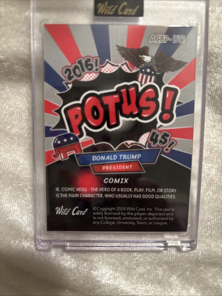 Original/Licensed Reprint:OriginalFeatures:ComixFranchise:AlluminationSigned By:President Donald J TrumpManufacturer:Wild CardFeatured Person/Artist:Donald Trump, President Donald J TrumpAutographed:NoType:Non-Sport Trading CardCharacter:President Donald J TrumpSet:AlluminationVintage:NoPrint Run:7Year Manufactured:2024