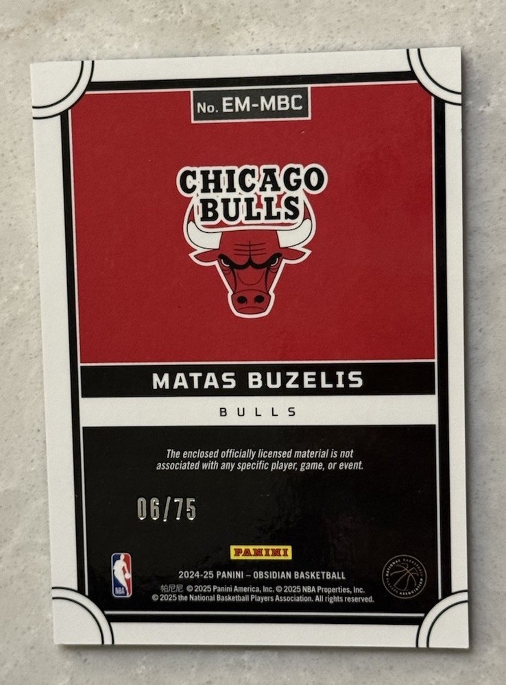 The product is a 2024-25 Panini Obsidian - Eclipse Materials Rookie Matas Buzelis /75 RC Patch trading card. This basketball card features a serial numbered patch of Matas Buzelis from the Chicago Bulls. It is a limited edition card with only 75 copies produced and belongs to the Electric Etch Purple parallel/variety set. As an insert card, it adds value and uniqueness to any sports trading card collection, especially for fans of the Chicago Bulls and collectors of rookie cards.