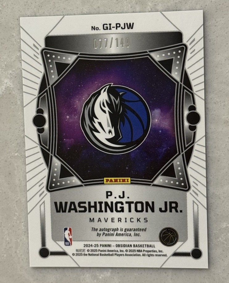 The 2024-25 Panini Obsidian Galaxy Ink PJ Washington Jr. autographed trading card is a rare collectible item limited to a print run of only 149. Featuring the talented player from the Dallas Mavericks in the National Basketball Association, this card is part of the exclusive Galaxy Ink insert set, adding a unique and valuable element to any basketball card collection. With its serial number and premium features, this card is a must-have for fans and collectors alike who appreciate the quality and detail put into each Panini trading card.