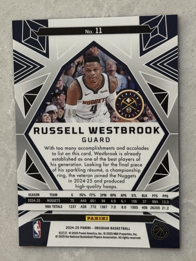 The product is a 2024-25 Panini Obsidian Russell Westbrook #11 Electric Etch Pink Flood trading card with a limited print run of only 49. This highly collectible item features a parallel variety design and is serial numbered, making it a rare find for basketball card enthusiasts. With its association with the Denver Nuggets and the dynamic skills of Russell Westbrook, this card is sure to be a valuable addition to any sports trading card collection.
