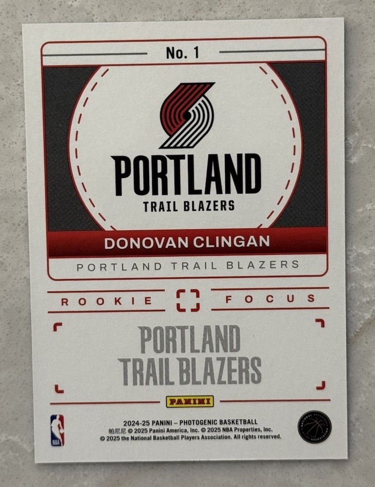 The 2024-25 Panini Photogenic - Rookie Focus Donovan Clingan #1 trading card is a highly sought-after collectible for basketball fans and card enthusiasts. This card features a rookie insert of NBA player Donovan Clingan from the Portland Trail Blazers, making it a valuable addition to any sports trading card collection. With its base parallel variety and unique design within the Rookie Focus insert set, this card offers a special glimpse into the upcoming talent of the basketball world in the 2024-25 season.