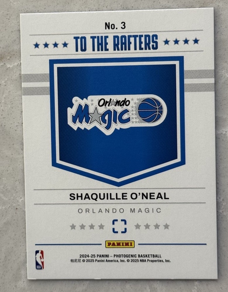 The product is a highly collectible 2024-25 Panini Photogenic trading card featuring Shaquille O'Neal from the Orlando Magic. This particular card is a part of the "To The Rafters" insert set, with a limited print run of only 35 copies. The card is serial numbered and classified as a "Groovy" parallel variety, making it a unique and sought-after item for basketball card collectors.