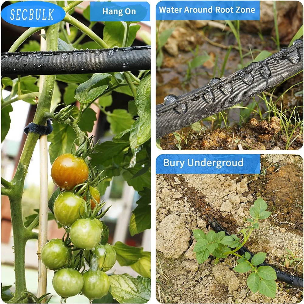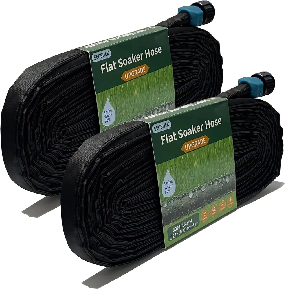 Consistent & Even Watering Drip Irrigation Hose: The 2025 Flat Soaker Hose is designed with a clog-resistant fabric cover made from recycled vinyl, ensuring uniform slow soaking throughout its entire length. This innovative design allows for effective watering across the entire area it covers, eliminating the risk of uneven watering and promoting healthier plant growth. By delivering water directly to the base of your plants, it minimizes water-related leaf damage, making it an essential tool for any gardener looking to optimize their irrigation practices. Linkable Drip Hose for DIY Irrigation System: This versatile soaker hose features an end-to-end connectable design, allowing you to create a customized irrigation system tailored to your garden’s needs. It can be easily buried under up to three inches of mulch or soil, or laid above ground, and is compatible with standard garden hose threads. The rust-resistant end caps facilitate seamless connections between multiple hoses, enhancing functionality when used with timers for automated watering solutions. Maneuverability and Eco-Friendly Design: Constructed with a double-layer PVC and extra-strength fabric, this soaker hose is designed to withstand sun damage better than traditional rubber hoses. Its durable construction ensures long-lasting performance, making it suitable for regular use throughout all seasons. Additionally, the hose is made from 100% environmentally-friendly recycled vinyl, compliant with CA65 standards, ensuring that water delivered to your garden is safe for edible plants such as vegetables and herbs. Easy to Store Flat Soaker Hose: The flat design of this irrigation drip hose is kink-resistant and lies flat, making it easy to roll up and store for future use. Its shape allows for effortless maneuvering around existing plant growth, ensuring that your garden remains well-watered without disrupting the layout. One-Year Warranty on Flat Soaker Hoses: For optimal performance, it is recommended to maintain a water pressure of 40-90 psi. Please note that hot water is not suitable for use with this product, ensuring longevity and efficiency in your watering system. Product Description Seckbulk offers a rich portfolio of Soaker hose sizes, allowing you to easily customize your garden irrigation system
