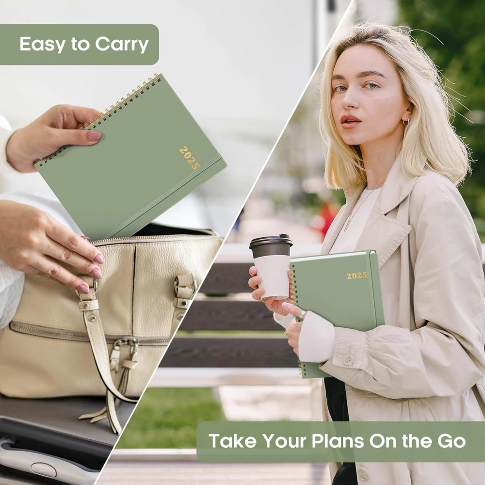 2025 Planner, Weekly and Monthly Calendar Planner Book, January 2025 - December 2025, HardCover Planner 2025 with Monthly Tabs, Notes Pages, Spiral Bound, Inner Pocket, A5 (6.4" x 8.5") - Green 2025 Planner Overview: Our aesthetic planner covers the period from January to December 2025, featuring 12 monthly pages and 53 weekly pages to help you easily organize the entire year, making it an essential supply for office, home, and school. Monthly Planner: Features previous and next month reference calendars, major holidays reminders for long-term planning, daily writing blocks and a dedicated notes section for important projects. With monthly tabs and motivational quotes, it's designed to inspire and organize your life, work, or study. Weekly Planner: Our agenda book planner 2025 features each two-page weekly spread, from Monday to Sunday, offering ample lined writing space. It also includes popular holidays, two-month reference previews, and a dedicated priorities area, making it easy to manage appointments, notes, and daily tasks. Paper to Meet Your Needs: Our premium thick paper not only prevents ink bleeding, allowing you to use your favorite pen on the planner, but also provides a smooth writing experience. Distinct Design: The strong spiral binding ensures the planner's durability. It also offers dedicated sections for notes, a 2025-2026 yearly overview, holiday reminders, dual-pockets, and more, making it a perfect planner for women, men, teachers, and students. Sustainability features This product has sustainability features recognized by trusted certifications. Forestry practices Made with materials from well-managed forests, recycled materials, and/or other controlled wood sources.