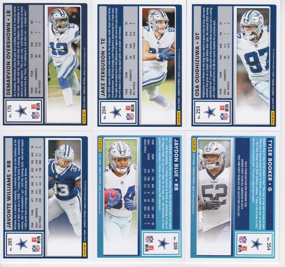 2025 Donruss Football Complete Team Set (12) Dallas Cowboys Tony Dorsett** Description: 2025 Donruss Football Complete Team set. Cards are similar to the cards in the picture. **These cards are from 2025 Donruss Factory sets. We opened up 8 sets and there were some cards with very light vertical printing lines on the front. Not noticable in the scans or if you have them displayed in a binder or if you just look at the card straight on, but you can see them if the light hits the card at the right angle. Cards that usually have this defect are ** below. Includes the following: #4 Emmitt Smith #10 Jonathan Mingo #29 Cee Dee Lamb #74 Tony Dorsett #104 Dak Prescott #109 Micah Parsons #175 Demarvion Overshown #204 Jake Ferguson #253 Osa Odighizuwa #265 Javonte Williams #308 Jaydon Blue RC** #354 Tyler Booker RC** Shipping: Calculated Shipping to U.S. - mailed in a plain white envelope. Shipping Discounts: Will discount shipping on multiple items won - $.25 additional for each card won. Please contact us on reduced shipping on sets and lots won. We only sell quality cards so please don't worry about bidding on a poor product. If there is something wrong with a card we will let you know. We stand behind the cards we sell and will refund your money if you are unhappy with any product. Please don't hesitate to contact us if you have any questions. Please see our other listings of Football Cards. _gsrx_vers_1730 (GS 9.9.4 (1730))