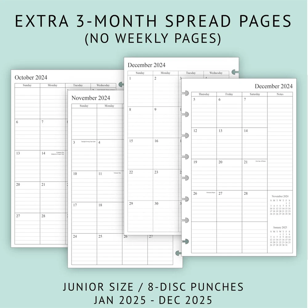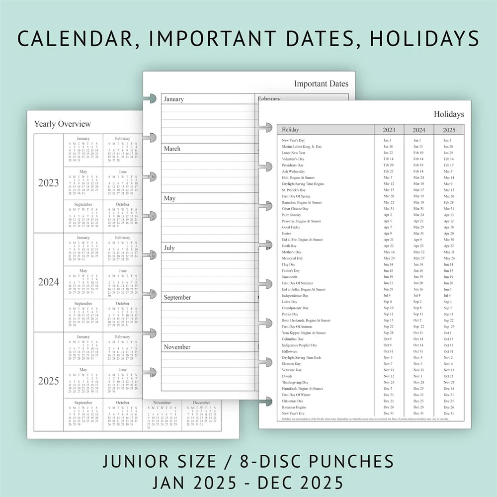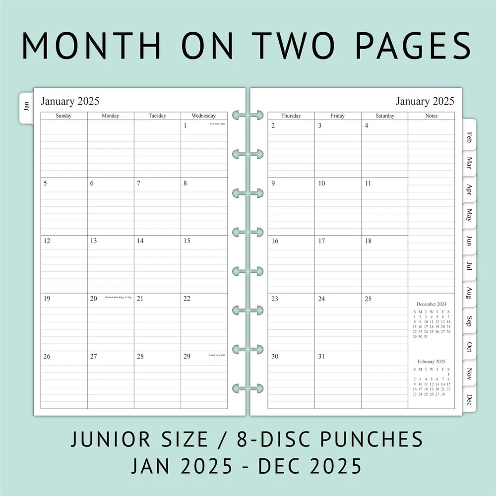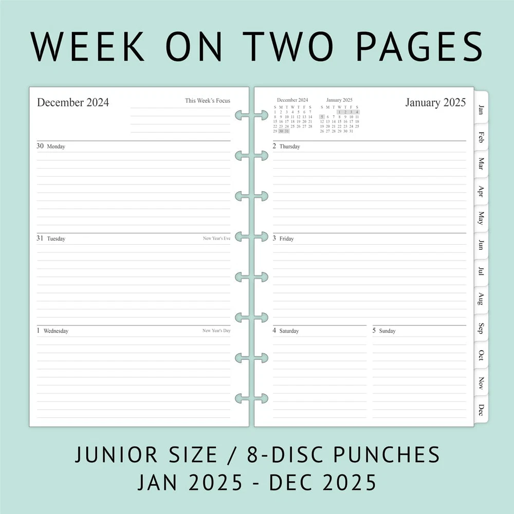 Fast Shipping Great Customer Support Satisfaction Guaranteed DESCRIPTION Shipping Shipping Shipping All domestic packages are shipped for Free (Unless other shipping method was selected during the checkout) Most items ship and arrive much sooner than the estimate delivery date. Usually within 2-3 days from payment. However, we have longer estimates to compensate for the occasional delay or supply chain breakdown. We do not accept P.O. BOXES - PLEASE PROVIDE A PHYSICAL ADDRESS Return Return Return In the event that you would like to return your purchase, we allow returns that are processed within the defined return date (the return date is to be found in the return policy/shipping and handling section) Please contact us for a return authorization and the return shipping address. Payment Payment Payment PayPal is our preferred method of payments it's the quickest, easiest and most secure way to pay for your goods or services online. PayPal offers buyer and seller protection should there be a problem. If you do not have a PayPal account, to get started and buy your first item with us is very easy. Simply click on the 'Buy It Now' button and follow the eBay checkout steps. Select PayPal as the payment method you then will be given the chance to enter your card details in to PayPal's secure checkout in order to pay for your order. Once the payment has been made, you will then be given the opportunity to make your own PayPal account to make paying for your items in the future very easy. Should there be a problem with payment please do let us know. Feedback Feedback Feedback Customer satisfaction is very important to us. If you have any problem with your order,please contact us and we will do our best to make you satisfied, please do not leave a negative feedback before we resolve your problem. We guarantee that your issue will be solved quickly. As long as you are happy with your purchase of , please leave us a positive feedback. Your feedback is very important to us it affects our search placement on eBay. We will leave a positive feedback for you in return automatically once we receive your feedback. Contact Us Contact Us Contact Us If you have any queries, please contact us via ebay. We usually respond within 24 hours on weekdays. Thank you for visiting our ebay store! 8-disc punched planner refills compatible with Arc, Levenger, TUL junior size discbound planners 2025 year weekly pages run from January 2025 to December 2025 Weekly spread includes Week's Focus & 2-month calendar sections on the top and a Monday to Sunday format 2 page monthly spread with ruled daily blocks, calendar & notes section, laminated tabs to allow quick turning Additional pages: calendar & holidays, contacts, yearly goals and important dates pages, 3 monthly spread pages for early planning (Oct 2024 to Dec 2024, no weekly pages) 2025 Junior Size Weekly & Monthly Planner Refill, 8-Discbound, 2 Pages/Week Click here to see description Fast Shipping Great Customer Support Satisfaction Guaranteed DESCRIPTION Shipping All domestic packages are shipped for Free (Unless other shipping method was selected during the checkout) We ship within two business days of payment, usually sooner Standard FREE shipping takes between 3-5 business days Expedited shipping takes between 2-3 business days Overnight shipping takes between 1-2 business days We do not accept P.O. BOXES - PLEASE PROVIDE A PHYSICAL ADDRESS We Ship Globally using ebay's GSP, the item is sent to a logistic center in KY and shipped from there to the rest of the world. International customers are responsible for all duties and taxes Contact your local authority for questions related to the amount of duties or taxes you will be responsible for Return In the event that you would like to return your purchase, we allow returns that are processed within the defined return date (the return date is to be found in the return policy/shipping and handling section) Please contact us for a return authorization and the return shipping address. Please contact us for a Return Merchandise Authorization (RMA) number. We advise you to use a reputable carrier service when returning your goods. Please pack all returns appropriately. We ship globally Via eBay's global shipping program (GSP). Thus we don't cover returns for items shipped globally. Buyers returning such items will be refunded ONLY for the item's cost and not for the shipping. please check the Voltage information and make sure it matches the one in your country. In case it's not stated in the description, do ask us. Payment PayPal is our preferred method of payments it's the quickest, easiest and most secure way to pay for your goods or services online. PayPal offers buyer and seller protection should there be a problem. If you do not have a PayPal account, to get started and buy your first item with us is very easy. Simply click on the 'Buy It Now' button and follow the eBay checkout steps. Select PayPal as the payment method you then will be given the chance to enter your card details in to PayPal's secure checkout in order to pay for your order. Once the payment has been made, you will then be given the opportunity to make your own PayPal account to make paying for your items in the future very easy. Should there be a problem with payment please do let us know. Feedback Customer satisfaction is very important to us. If you have any problem with your order,please contact us and we will do our best to make you satisfied, please do not leave a negative feedback before we resolve your problem. We guarantee that your issue will be solved quickly. As long as you are happy with your purchase of , please leave us a positive feedback. Your feedback is very important to us it affects our search placement on eBay. We will leave a positive feedback for you in return automatically once we receive your feedback. Contact Us If you have any queries, please contact us via ebay. We usually respond within 24 hours on weekdays. Thank you 