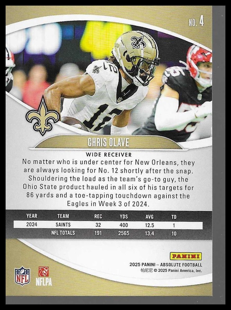 Up for sale is a 2025 Panini Absolute #4 Chris Olave Yellow Parallel Card. This ungraded card features Olave, wide receiver for the New Orleans Saints, in the Yellow parallel design from the 2025 Panini Absolute Football release. • Card Number: #4 • Subset/Parallel: Yellow Parallel • Set: 2025 Panini Absolute Football • Team: New Orleans Saints • Condition: Near Mint or better (ungraded) • Attributes: Colored parallel variant of the base card Perfect addition for Saints fans, Chris Olave collectors, or anyone building the 2025 Panini Absolute parallel set. Check out our other listings for more rookies, veterans, parallels, and chase inserts. Track Page Views With Auctiva's Counter