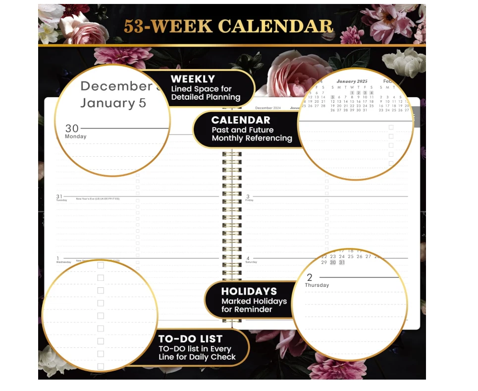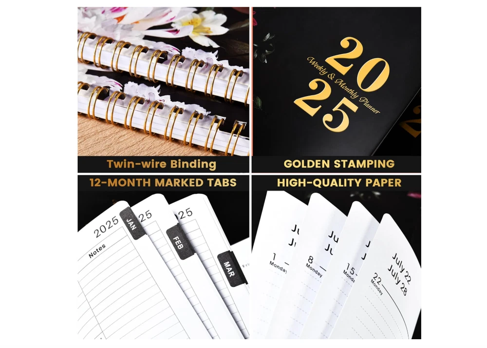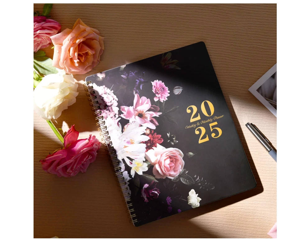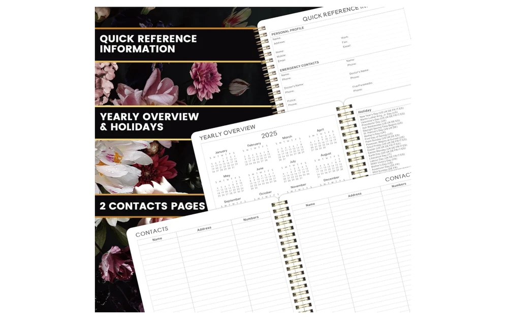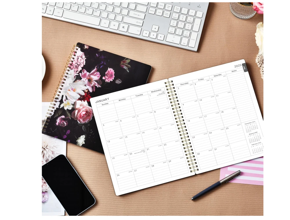 2025 Floral Planner – Your Perfect Planning Companion! Stay organized and stylish in 2025 with this beautifully designed floral planner, perfect for all your scheduling and planning needs. From January 2025 to December 2025, this planner offers ample space and functional features to help you stay on top of your tasks throughout the year. 2025 Planner Overview This planner covers 12 months, from January to December 2025, and comes in a practical 8" x 10" size. Its spacious design provides plenty of room for daily planning and scheduling, ensuring you have all the space you need to manage your busy life. Monthly Pages The monthly planning pages include a 12-month calendar overview, with lined daily blocks for easy note-taking. You'll also find holiday reminders, a lined note section, and three reference calendars (past, present, and future) at the page corners. These features help you better organize and plan your month with ease. Weekly Pages The weekly pages clearly list dates from Monday to Sunday on two pages, with a lined section for each day where you can jot down your plans. A small checkbox next to each task helps you track progress and stay organized. Additionally, each week features a three-month reference calendar at the top for quick planning. Functional and Durable Design This planner is designed with functionality and durability in mind. It includes: Stamped hardcover with a gorgeous bronzed pattern Premium thick paper to prevent ink-bleeding and feathering Strong twin-wire binding for easy handling and long-lasting use Yearly overview for a quick glance at the entire year Monthly tabs for easy navigation Quick reference information and contact pages for added convenience Holidays marked to keep you on track throughout the year Perfect Gift or Personal Use With its beautiful bronzing pattern and high-quality paper, this planner not only helps you stay organized but also adds elegance to your daily routine. It makes a thoughtful gift for friends, family, or loved ones, or a perfect personal planner to make your 2025 year truly special. Get Ready to Plan in Style The 2025 Floral Planner is more than just a calendar—it's a tool for staying organized and productive while adding a touch of beauty to your life. Don't wait—grab yours today and start planning for a successful 2025!