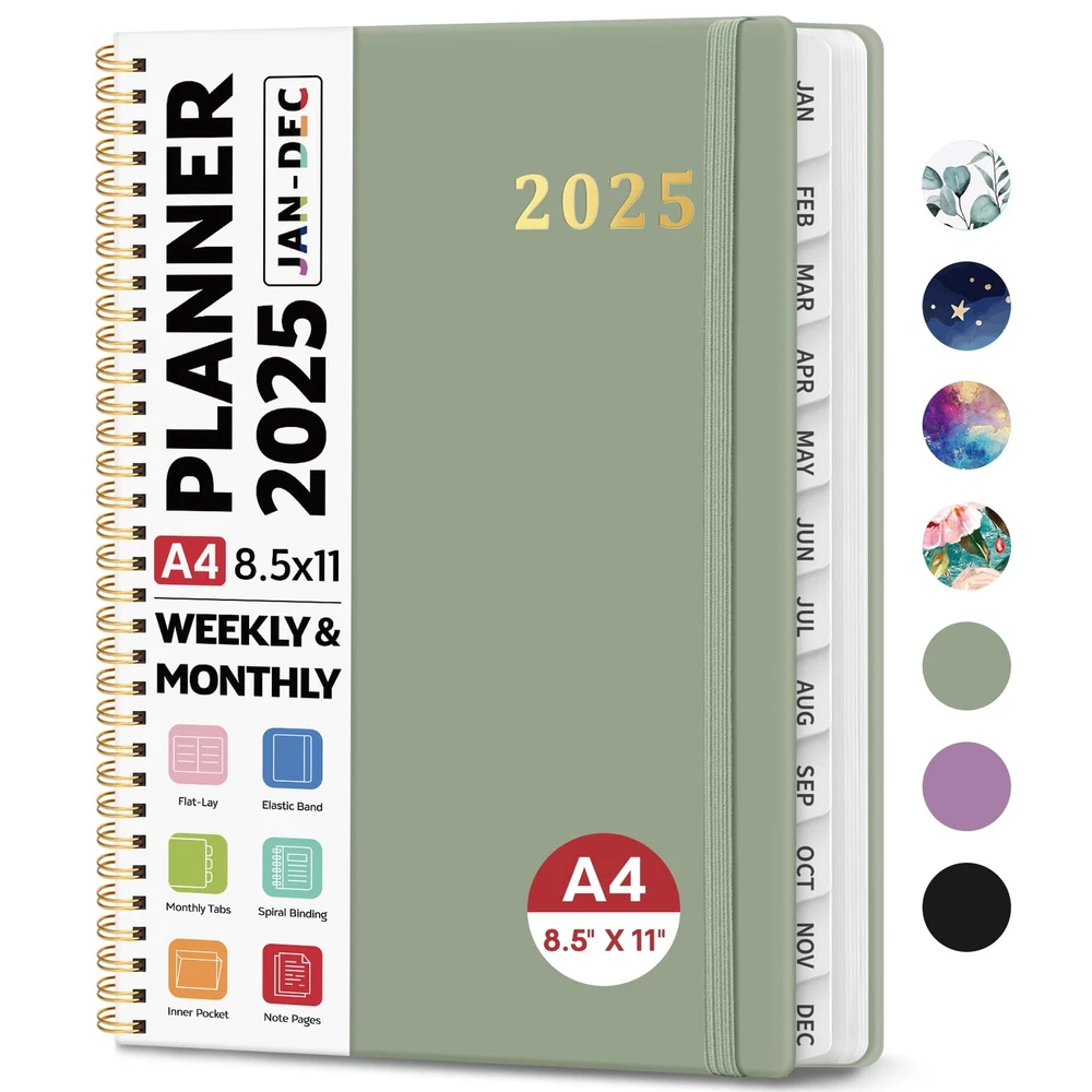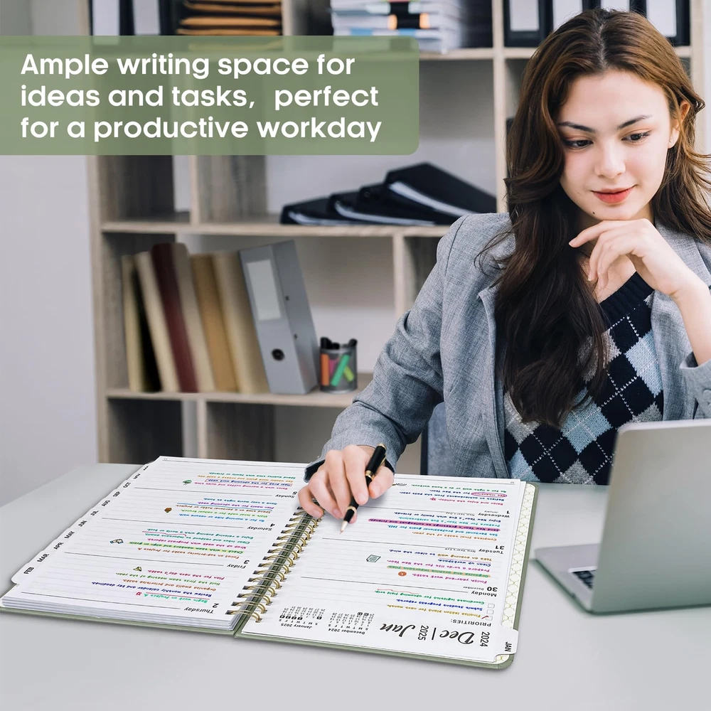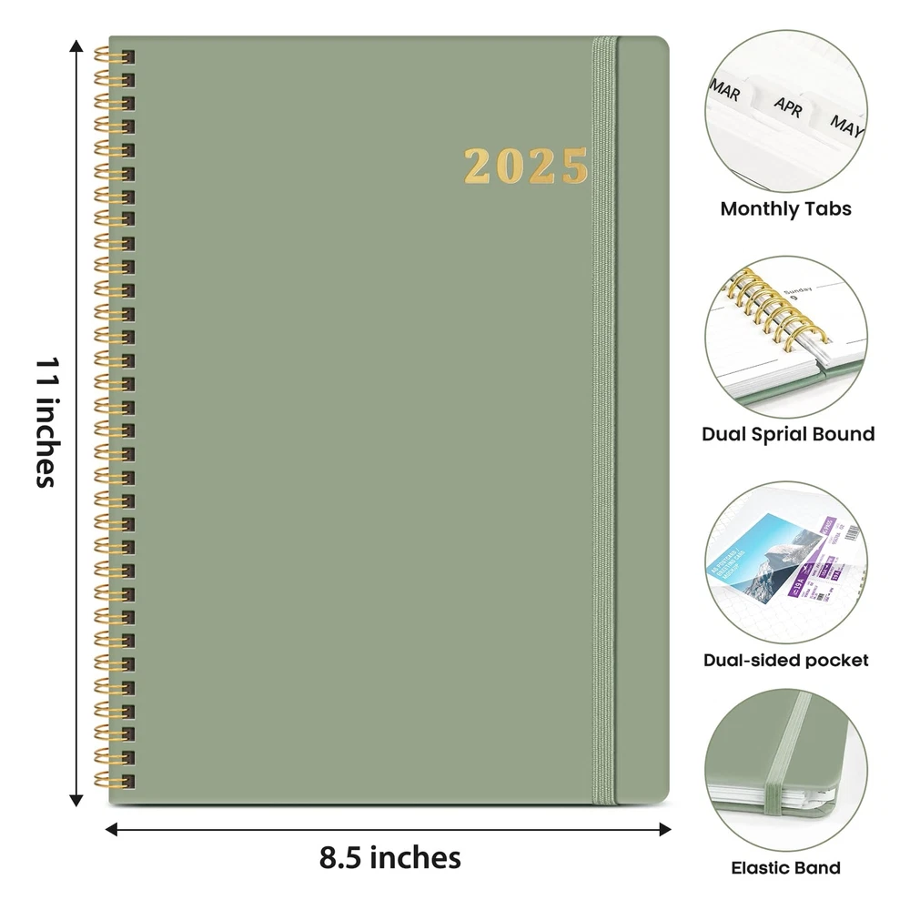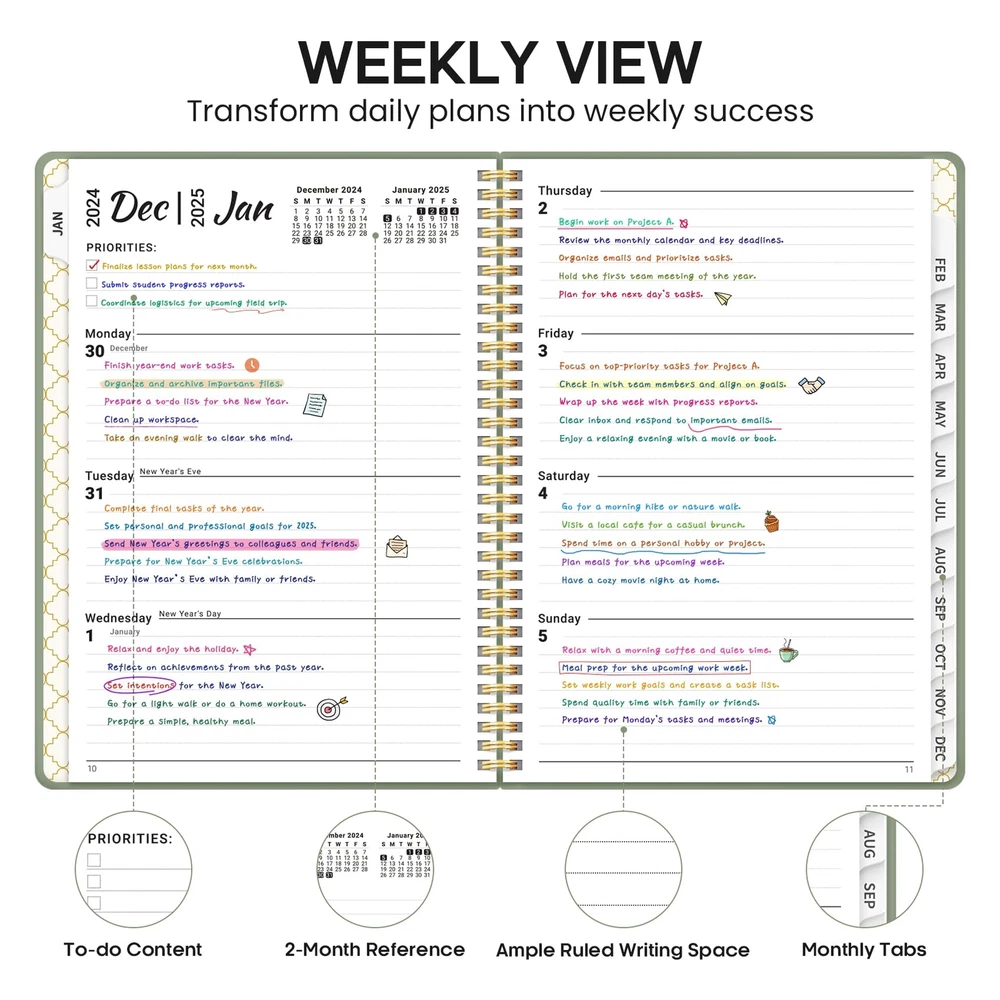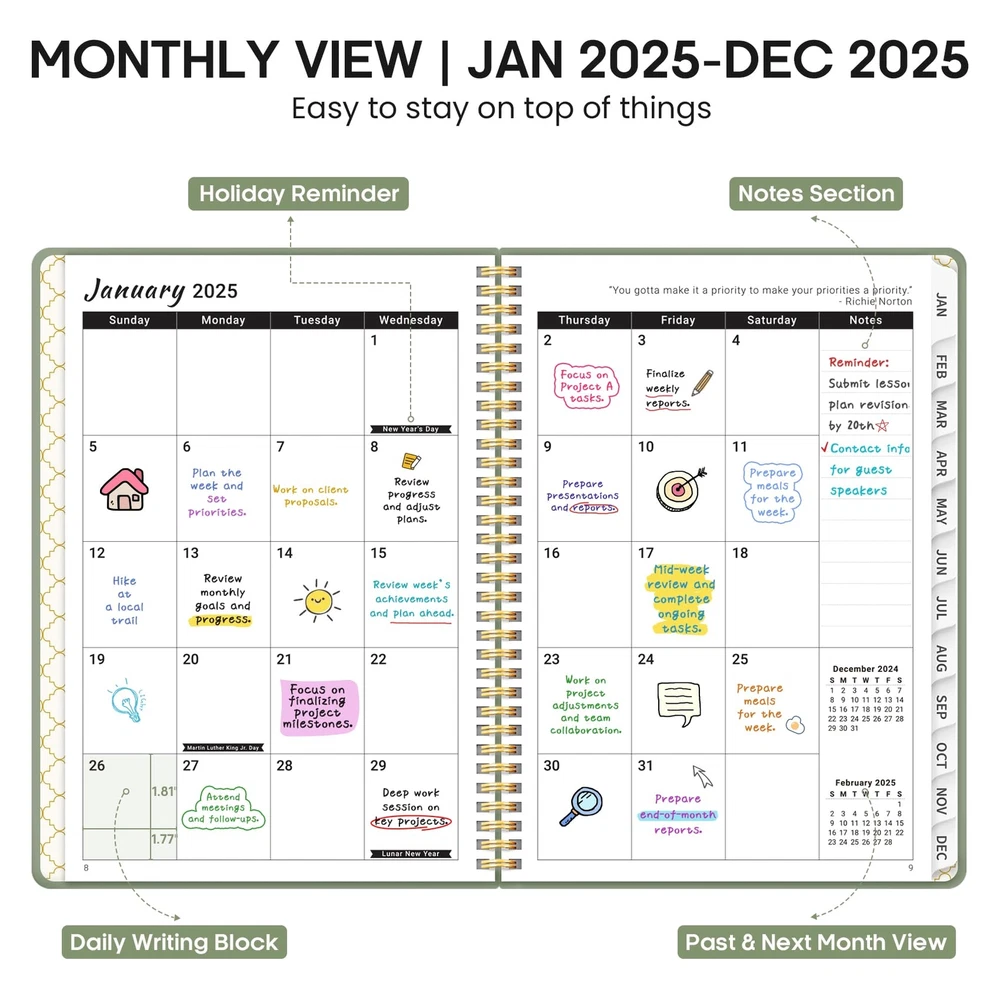 2025 Planner Overview: Our aesthetic planner covers the period from January to December 2025, featuring 12 monthly pages and 53 weekly pages to help you easily organize the entire year, making it an essential supply for office, home, and school. Monthly Planner: Features previous and next month reference calendars, major holidays reminders for long-term planning, daily writing blocks and a dedicated notes section for important projects. With monthly tabs and motivational quotes, it's designed to inspire and organize your life, work, or study. Weekly Planner: Our agenda book planner 2025 features each two-page weekly spread, from Monday to Sunday, offering ample lined writing space. It also includes popular holidays, two-month reference previews, and a dedicated priorities area, making it easy to manage appointments, notes, and daily tasks. Paper to Meet Your Needs: Our premium thick paper not only prevents ink bleeding, allowing you to use your favorite pen on the planner, but also provides a smooth writing experience. Distinct Design: The strong spiral binding ensures the planner's durability. It also offers dedicated sections for notes, a 2025-2026 yearly overview, holiday reminders, dual-pockets, and more, making it a perfect planner for women, men, teachers, and students.