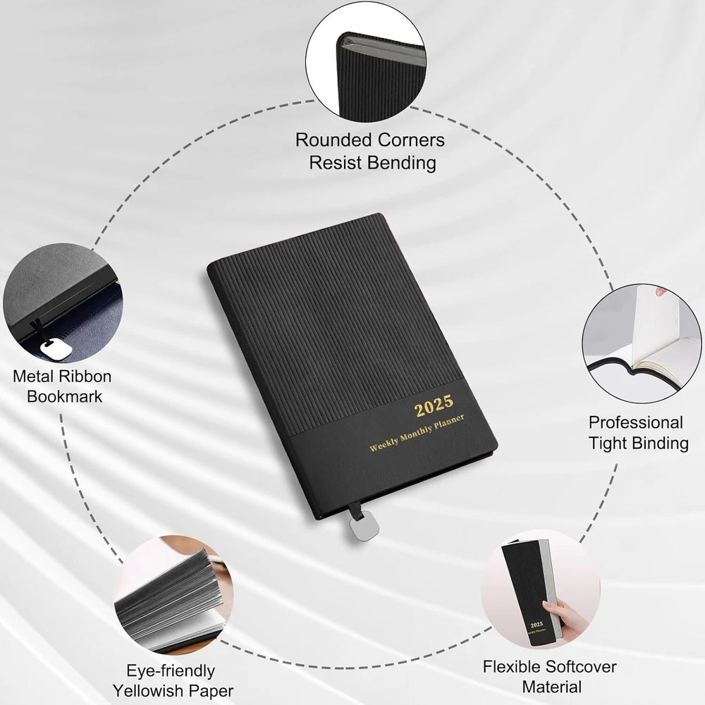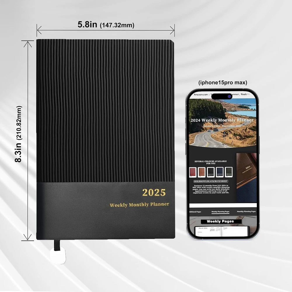 2025 Planner, Weekly Monthly Planner 2025, 8.25"×5.85", 12 Months, Black Product Details Brand: Ymumuda Color: Black Cover Material: Faux Leather Year: 2025 Format: Notebook Calendar Type: Weekly Monthly Planner Target Audience: Kid, Adult, Student, Officer Sheet Size: 5.85 X 8.25 inches Material: Paper Pages: 144 Pages 【 YMUMUDA 2025 PLANNER 】This planner 2025 hardcover (8.25"×5.85") features 12 months from JAN. 2025 to DEC. 2025 with weekly monthly planning pages, the planner offers other additional pages to help you well organized for the academic year and increase productivity. 【 MONTHLY PLANNING 】Each monthly pages with lined daily blocks lists major US holidays and Julian dates, the calendar planner 2025 also contains a notes section and past/previous calendar reference for your better past reviewing and future planning. 【WEEKLY PLANNING】Weekly view pages contain enough ruled space for your detailed daily planning, appointments, activities and so on. Major Holidays Listed, elapsed and remaining days noted. Priorities section is designed to focus your energy on your most important goals. 【PROFESSIONAL DESIGN 】Planner Special Soft Cover | Safty Round Corner Design | Professional Tight Binding Metal | Ribbon Bookmark | Yearly Overview | Contacts | Quick Reference Information | Monthly Printed Tabs | Holidays | Weekly and Monthly Pages . 5 colors(Black/ Blue/ Brown/ Red/ Green) available for you to choose.
