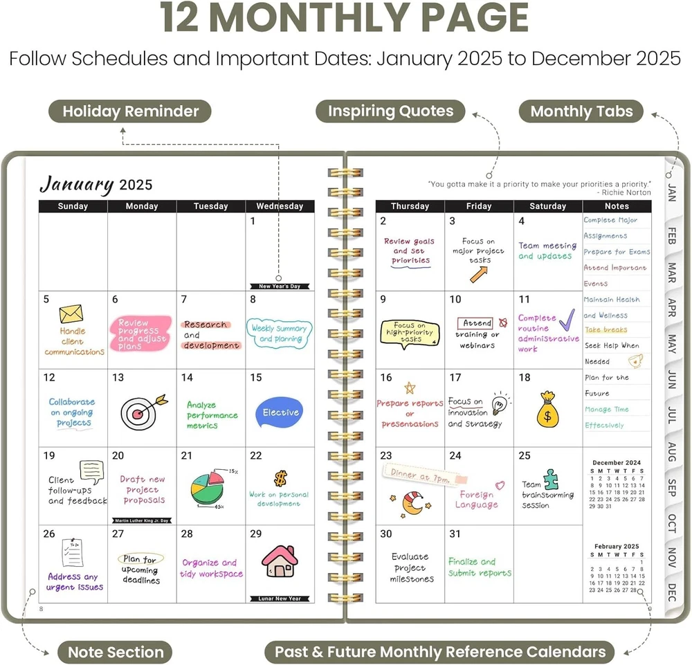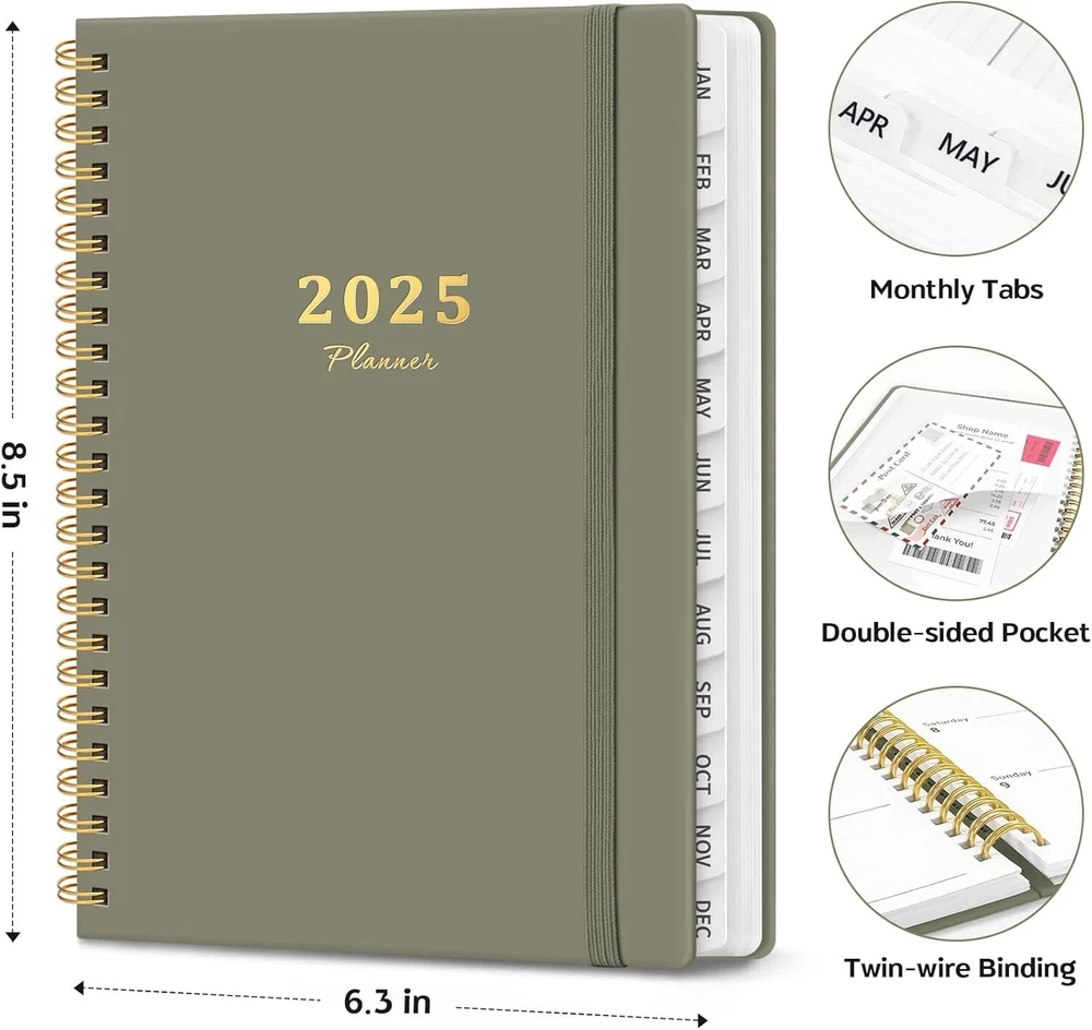 2025 Planner Weekly and Monthly Calendar January 2025 A.Green Writing Style:Style 1- Green Color: A.Green Cover Material Paper Year: 2025 Calendar Type Weekly & Monthly Target Audience Teacher, Adult, Student, Teen Sheet Size: A5 Inches Material: Paper Item Weight: 11.68 ounces Pages: 160 Pages Start 2025 with Purpose: Embrace the new year with confidence using our ZOTIA 2025 Planner! Designed to cover January through December, this planner perfectly balances monthly and weekly layouts. At a convenient 6.3" x 8.5", it’s the ideal companion for tracking work goals, appointments, and daily priorities with precision and purpose. Effortless Monthly Planning: Stay organized and ahead of the curve with spacious daily blocks and holiday reminders on each monthly spread. Access past and future reference calendars, ensuring you have all the tools for seamless long-term planning right at your fingertips. Streamlined Weekly Organization: Achieve your weekly goals with ease! Each weekly page offers ample lined space for appointments, events, and to-do lists, complete with checkboxes to keep you on track. Celebrate your achievements as you navigate through the week! Stylish and Functional Design: The ZOTIA 2025 Planner combines thick, high-quality paper with a durable hardcover, designed to fit your lifestyle. Monthly tabs, twin-wire binding, and an elastic band for secure closure add practicality while maintaining a sleek, modern aesthetic. Elevate Your Productivity: Take charge of your time and unlock your full potential! Capture daily tasks, notes, big ideas, and important meetings all in one place. Ready to transform your ambitions into reality? Grab your ZOTIA 2025 Planner today and make this your most productive year yet! Return Policy: We offer a 30 day return policy from the receiving date. Please contact us for a Free Return Label. Please use our return label so it will go back to our supplier and we can do a refund or replacement afterwards. Feedback: Your satisfaction is very important to us! If you have any problem with your order, please contact us and we will do our very best to make you satisfied. As long as you are happy with your purchase, please leave a positive feedback for us. We will always leave you a positive feedback in return. If you have any problem with your purchase, please do not leave a negative feedback. Please Contact us ... and your issue will be solved quickly and positively We are a small family-owned business trying to make a living, not a huge company that does not care ... We will ALWAYS do our best for you!