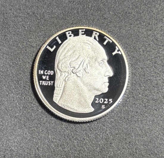 Country of Origin: United States Nomination: 25c Year: 2025 Type: Quarter Certification: Uncertified Grade: Ungraded Circulated/Uncirculated: Uncirculated Mint Mark: S Certification Number: Uncertified Fineness: 0.999 .999 999 Dealer: Keystone Coin Exchange Composition: Silver Mint Location: San Francisco Denomination: 25C Strike Type: Proof