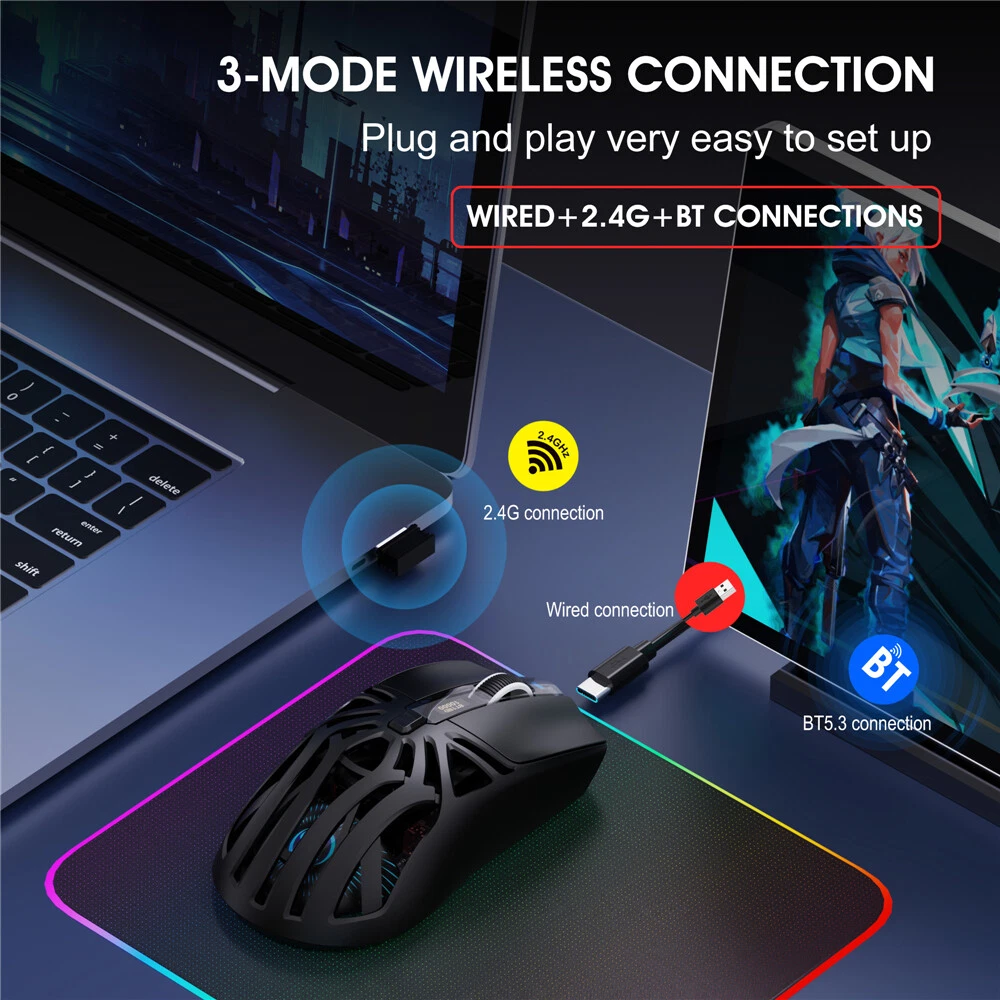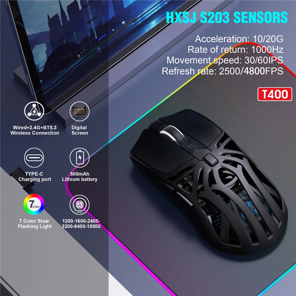 Product Description 2025 New T400 3-mode wireless gaming mouse 1000HZ 500mAh rechargeable 10000DPI USB-type C macro optical office mouse for pc Specification parameters: Model: T400 Three mode game mouse Sensor:INST S203 Connection mode:Wired+2.4G+BT5.3 Rate of return: 125-250-500-1000Hz(Default 1000Hz) Movement speed: 30/60IPS Frame Rate:2500/4800FPS Acceleration: 10/20G Operation Mode: Opto-electronic Power Type : Rechargeable Mouse interface:Type-C Key life: 20 million times Wireless distance: 10m Battery capacity: 500mA Rated voltage / current : 3.7V / 10mA Resolution: 1200-1600-2400-3200-6400-10000dpi(Corresponding movement speed gear color prompt: red-green-blue-yellow-blue-purple (with memory)) Number of keys: 6 keys programmable(BT5.3 mode does not support macro programming) Product Size: 12.3x6.4x3.7cm Product weight:75g Packaging size:13.3x10.3x4.9cm Packaging weight:160g Products include: 1 * T400the third mock examination wireless mouse 1 * 1.5M braided data cable 1 * User manual Operating systems: Windows Vista, Win7/8/10/11, Mac IOS X10.5 or Linux Later. Installation and use steps: (lower schematic): Wired connection: Insert the mouse USB cable into the USB port of the computer. The data cable Type-C interface can be directly used when the mouse is inserted. Wired is preferred in Bluetooth, 2.4G, Off 3 segments. 2.4G connection: If no pairing is performed, red the indicator blinks slowly. Hold down the Mode button key for 3S, and red the indicator blinks quickly to enter the pairing state. Plug in the receiver, and after the connection is successful, the mode indicator will keep on for 3 seconds indicating that the connection is successful. BT5.3 connection: If no pairing occurs, blue the indicator blinks slowly. Hold down the Mode button key for 3S, and blue the indicator blinks quickly to enter the pairing state. The device searches for the corresponding Bluetooth name “T400 BT5.3" and connects to the device. Gaming Mouse Macro Programming Software Instructions: 1. Download the macro programming software from the link provided by the seller. 2. Open the downloaded software to start using it. There are a total of 7 buttons available for macro programming. Remarks: The macro programming software for the T400 mouse only supports 2.4G mode and wired mode, not Bluetooth mode. Mac OS support macro. About Us Payment Shipping Terms Contact Us Welcome to our store! We are a professional worldwide wholesale company, with our own factory located in China. We supply many products including video game, health & beauty, phone accessories, computers accessories, camera & camcorder,car accessories, Clothing accessories, games, toys & hobbies, jewelry, antique & craftwork. High product quality,reasonable prices, excellent customer service and a reliable credit standing is our tenet. We accept PayPal only. Payment must be received in 7 business days of auction closing. Please leave note for your special request (e.g. Colors or Size) in PayPal when you pay the order. Any special request cannot be accepted after 24 hours of payment, because most of orders will be processed instantly and same day dispatched. Item will be shipped out within 48 hours upon receipt of your payment. The shipping time details, please read the shipping and delivery together with the price. We ship to your PayPal address. Please make sure your PayPal address is correct before you pay. Considering the cost of business and easy shipping, usually the item is packed in retail packaging. Country Shipping Time Working Days + Saturday + Sunday 5-7 8-15 16-20 21-25 26-30 >31 United States Rate(item arrived) 5.1% 50.1% 29.6% 10.5% 4.7% Refund United Kingdom Rate(item arrived) 9.9% 63.2% 19.1% 3.4% 4.4% Refund Australia Rate(item arrived) 21.4% 50.0% 14.3% 7.2% 7.1% Refund France Rate(item arrived) 10.5% 28.6% 43.8% 10.1% 7.0% Refund Germany Rate(item arrived) 11.1% 22.2% 30.3% 20.9% 15.5% Refund Canada Rate(item arrived) 0.0% 47.1% 31.4% 17.6% 3.9% Refund Spain Rate(item arrived) 3.7% 24.1% 48.2% 13.8% 10.2% Refund If this item is defective upon receipt, customer has up to 14 days from date of receipt for exchange of a new one.But buyers should be pay for the shipping charge for returning. We care about our valued customers, and are always willing to work things out. If you have any problems, please e-mail us immediately. If you have any questions, please feel free to send eBay message to us, our service specialists 24 Hours a Day, 7 Days a Week (maybe there is some delay in weekends). Our aim is to provide Top Level Customer Service, normally so we will try our best to solve any problem. Please DON'T leave negative or neutral feedback if you haven't received item in 30 days, because we have mentioned the shipping time repeatedly. About Us Welcome to our store! We are a professional worldwide wholesale company, with our own factory located in China. We supply many products including video game, health & beauty, phone accessories, computers accessories, camera & camcorder,car accessories, Clothing accessories, games, toys & hobbies, jewelry, antique & craftwork. High product quality,reasonable prices, excellent customer service and a reliable credit standing is our tenet. Payment We accept PayPal only. Payment must be received in 7 business days of auction closing. Please leave note for your special request (e.g. Colors or Size) in PayPal when you pay the order. Any special request cannot be accepted after 24 hours of payment, because most of orders will be processed instantly and same day dispatched. Shipping Item will be shipped out within 48 hours upon receipt of your payment. The shipping time details, please read the shipping and delivery together with the price. We ship to your PayPal address. Please make sure your PayPal address is correct before you pay. Considering the cost of business and easy shipping, usually the item is packed in retail packaging. Country Shipping Time Working Days + Saturday + Sunday 5-7 8-15 1