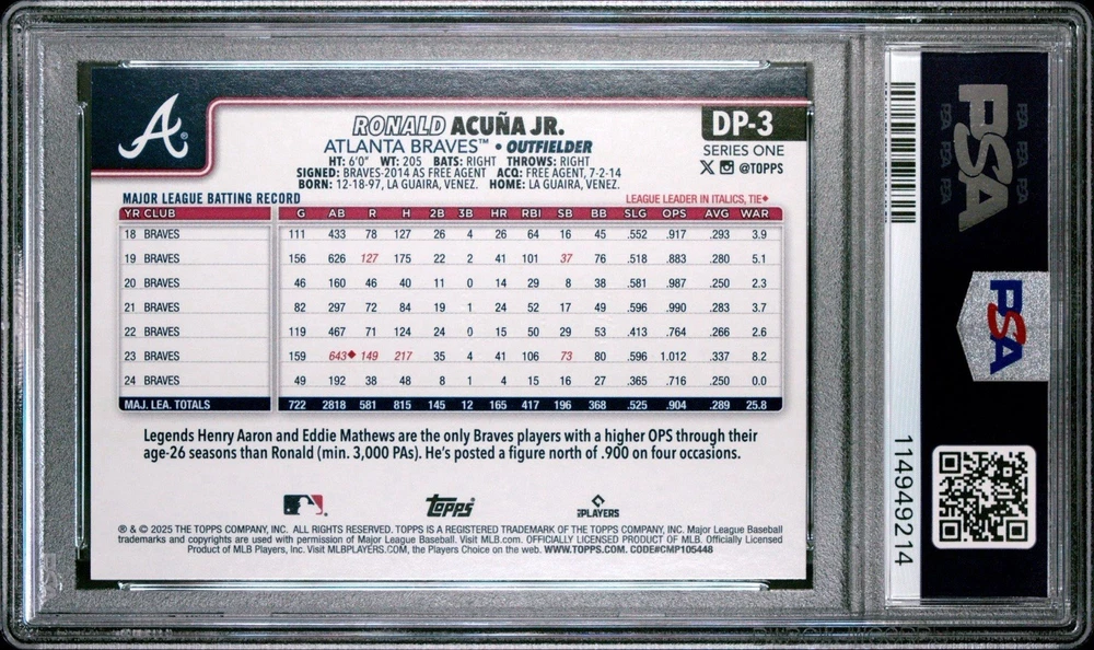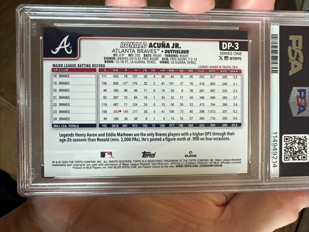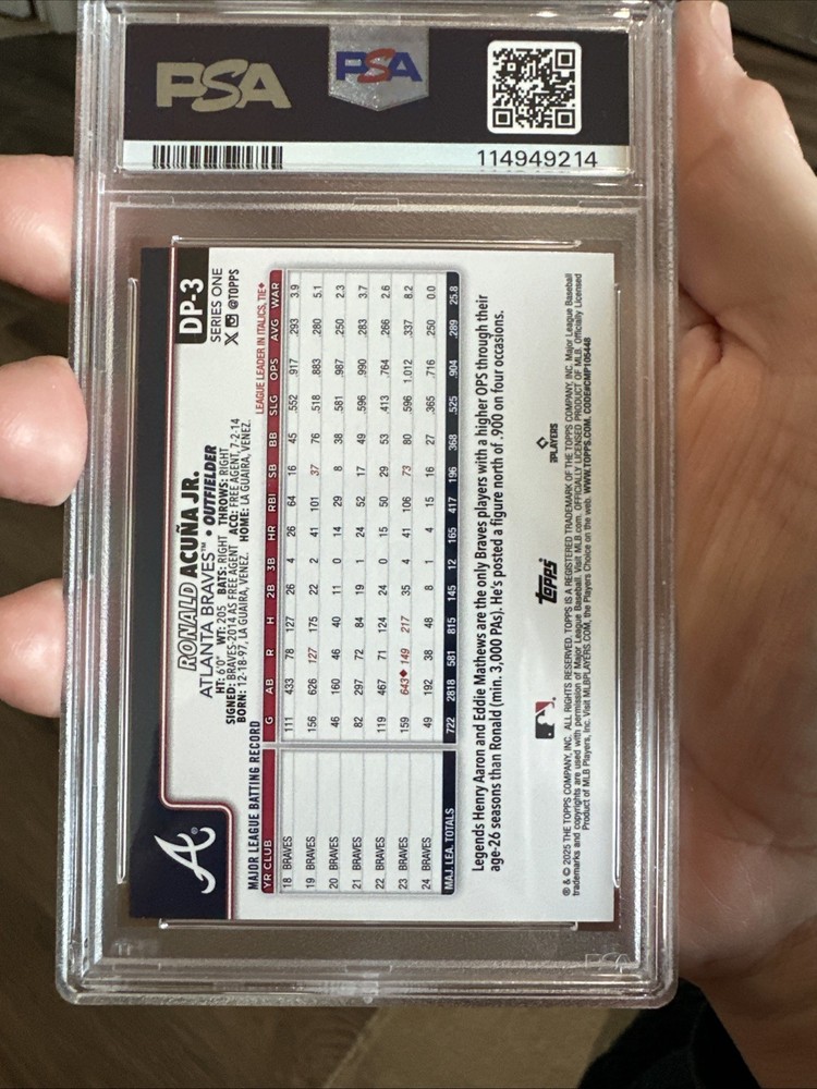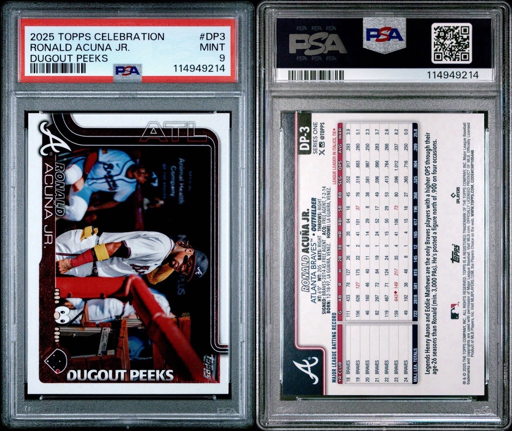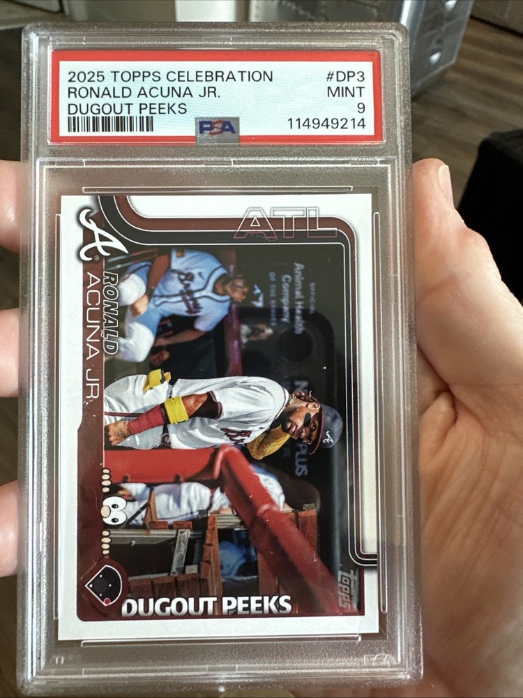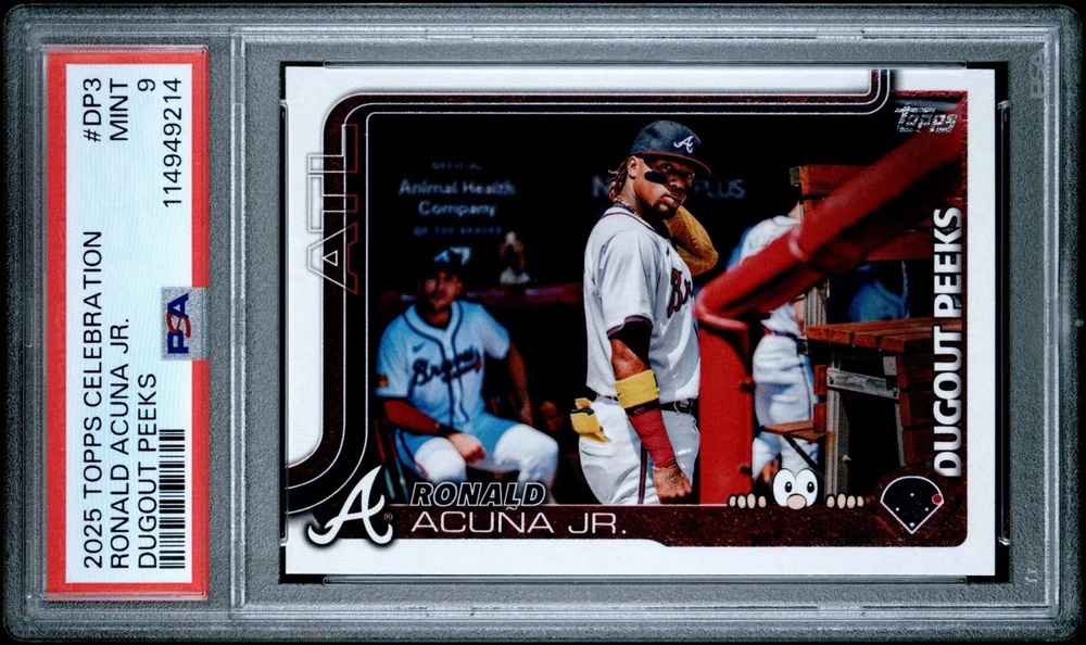 2025 TOPPS CELEBRATION RONALD ACUNA JR. DUGOUT PEEKS PSA 9. Condition is Graded. Shipped with USPS Ground Advantage.