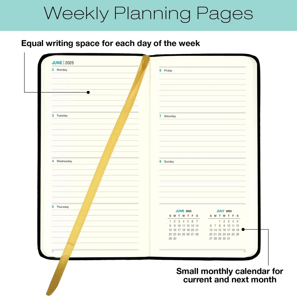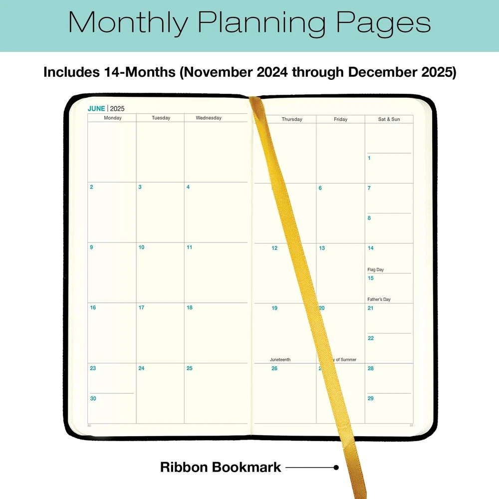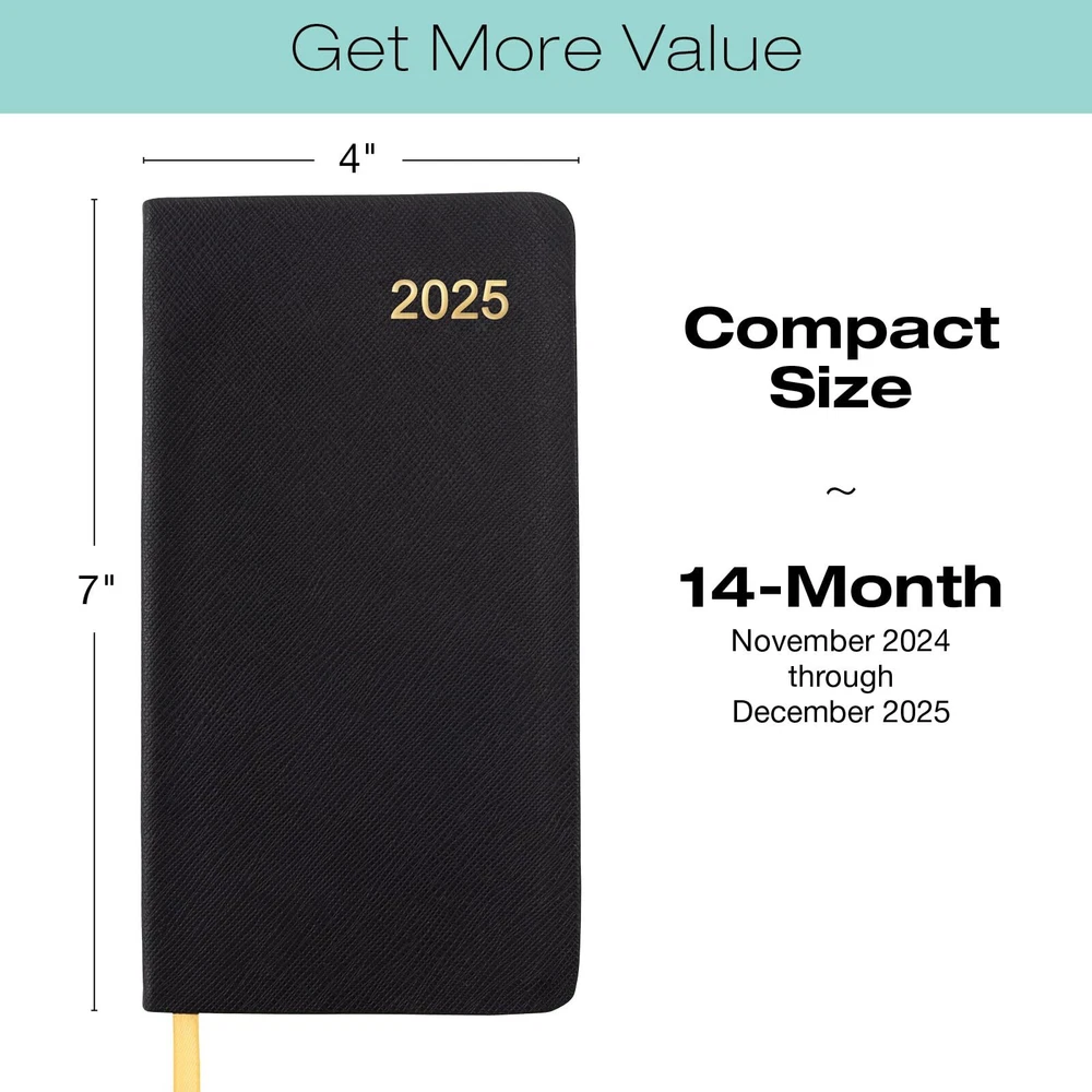 2025 Textured Cover Weekly Monthly Pocket Planner/Pocket Calendar, 4"x7": 14 Months (November 2024 - December 2025) / 2025 Calendar / 2025 Weekly Calendar/Weekly Planner Organizer (Black) 2025 Textured Cover Weekly Monthly Pocket Planner/Pocket Calendar, 4"x7": 14 Months (November 2024 - December 2025) / 2025 Calendar / 2025 Weekly Calendar /Weekly Planner Organizer (Black) START USING IMMEDIATATELY: 14 Month Planner (November 2024 through December 2025) FEATURES: 2 Page Monthly Spreads followed by 2 Page Weekly Spreads, and 21 Notes Pages. COVER MATERIAL: High-quality, textured cover that's flexible, water resistant and has an elastic closure POCKET SIZED: 4"x7" is perfect to carry in your pocket, bag, or purse. INCLUDES: A Stitched-in Page Marking Ribbon Shipping from the USA All of our products are shipped from the USA, ensuring quick delivery to your destination. Payment We offer the following payment methods: PayPal, credit card, bank transfer, and eBay's secure payment system. Free Shipping & Free Returns Shipping within the USA is FREE. Additionally, any return is absolutely free for you. Risk-Free Purchase You have the option to return an item within 30 days without any justification. We cover the return shipping costs! Fast Shipping We ship immediately upon receipt of payment. Generally, the package is delivered within 2-3 days in the USA. If it takes longer, we will contact you. Quality and Costs Made in Europe, USA, China No customs fees or additional charges Total satisfaction guarantee Invoice with declared VAT available upon request in .pdf format Feedback Your feedback is very important to us. After you pay for your purchase, you will automatically receive positive feedback from us.