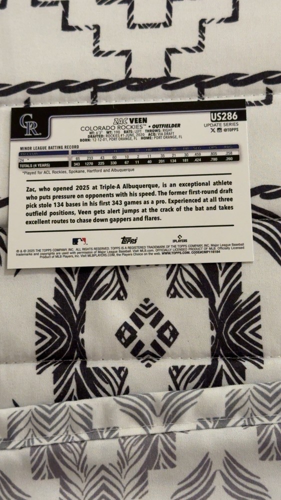 The 2025 Topps Update Series trading card featuring Zac Veen, a rookie player for the Colorado Rockies in Major League Baseball, is a highly sought-after collectible for fans and collectors alike. This card is part of the base set for the 2025 season, produced by Topps, a well-known manufacturer in the sports trading card industry. With its unique design and limited availability, this trading card showcases the up-and-coming talent of Zac Veen and is a valuable addition to any baseball card collection.