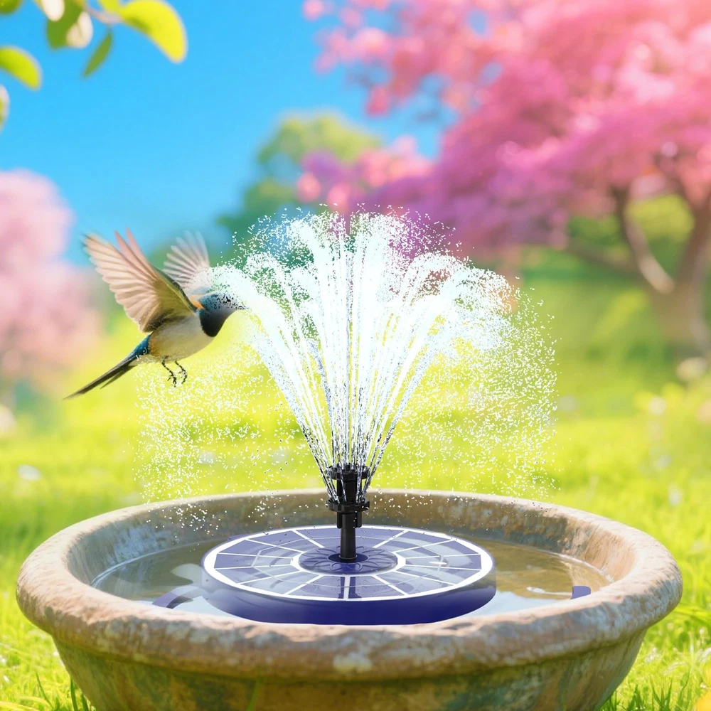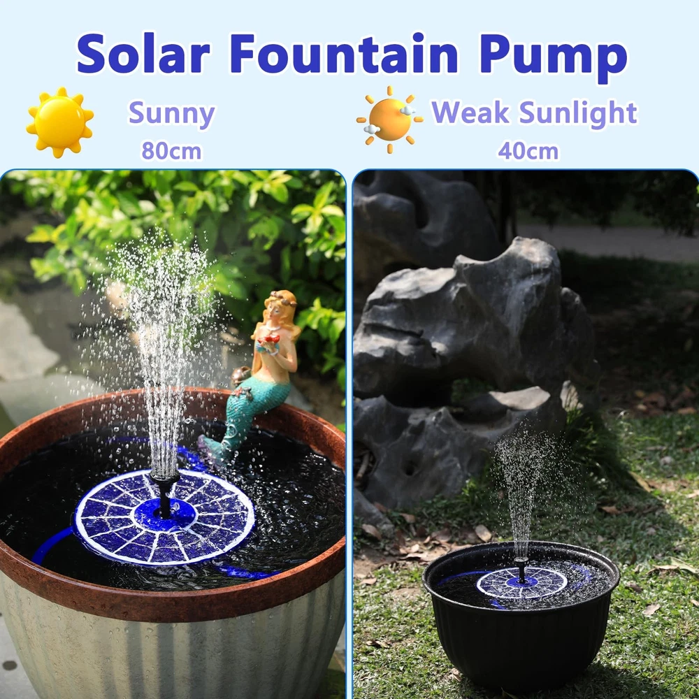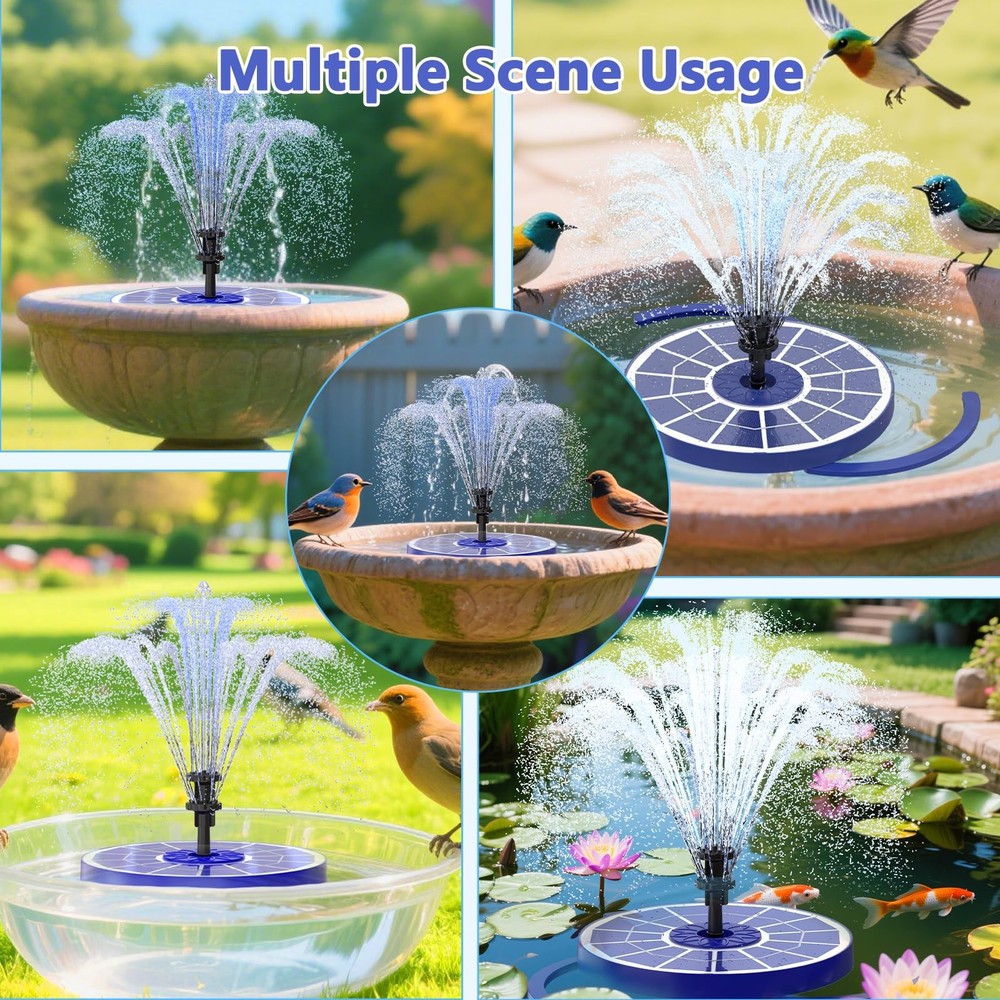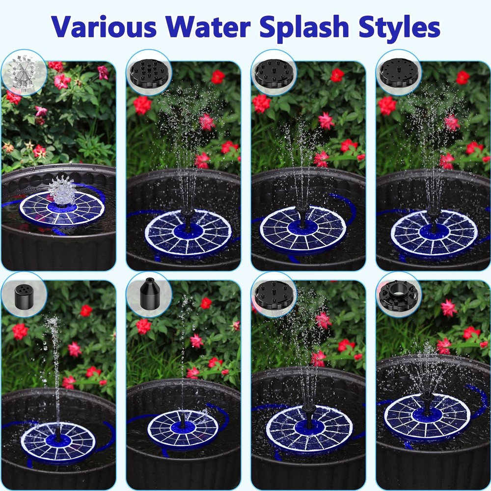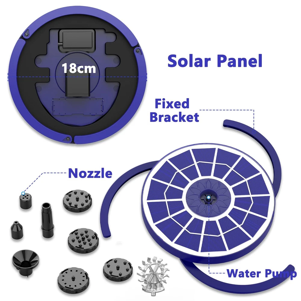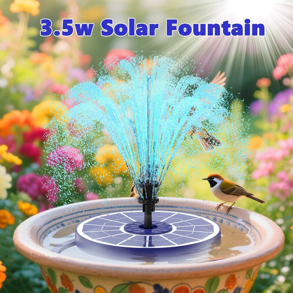 3.5W Solar Fountain Pump for Bird Bath Upgraded 2025, Floating Solar Water Fountain Kit with 8 Nozzles & 3 Integrated Bracket for Garden, Pond, Pool, Water Feature and Outdoor (Dark Blue) [✔3.5W High efficiency solar fountains]: The solar panel of the solar bird bath fountain uses an upgraded efficient glass panel, and the solar energy conversion efficiency is higher. Just put the solar panel in the sun and water will be sprayed immediately. The spray height of the solar powered water fountain is determined by the sunlight. The stronger the sunlight, the higher the spray height, up to 31.5 inches [✔Unique 8 spray modes]: The solar powered fountain includes 8 different nozzles, including a unique windmill nozzle and a nozzle that can make double-layer water splashes, creating a variety of eye-catching effects. Each nozzle has a different spray shape and height. You can freely DIY and replace the nozzle according to your preferences. It is very suitable for attracting various small animals outdoors and making DIY water features [✔Anti-drift design]: The solar bird bath fountains is equipped with 3 integrated brackets, which fix the fountain in the center of the bird bath to prevent the floating solar fountain from moving freely and reduce the frequency of adding water to the bird bath. When using, you only need to unfold the bracket. When not in use, the bracket can be stored on the solar fountain without worrying about it taking up space [✔Water shortage protection and anti-clogging]: The solar water pump is equipped with a water shortage sensor and anti-clogging technology. When the water level is too low, the water pump will stop working. The anti-clogging technology of the water pump prevents dirt, leaves and debris from entering, ensuring the smooth operation of the fountain. It greatly extends the service life of the water fountain and accompanies you for more happy times [✔Simple and convenient]: Place the bird bath fountain in sunny water, and it will immediately start to spray a gentle stream of water upwards, easy to use. Due to the high solar energy conversion efficiency of the garden fountain, it will spray a continuous and steady stream of water. The solar fountain pump is very suitable for bird bath, pond, pool, garden, and outdoor activities. This outdoor water fountain will attract hummingbirds and add fun to your life