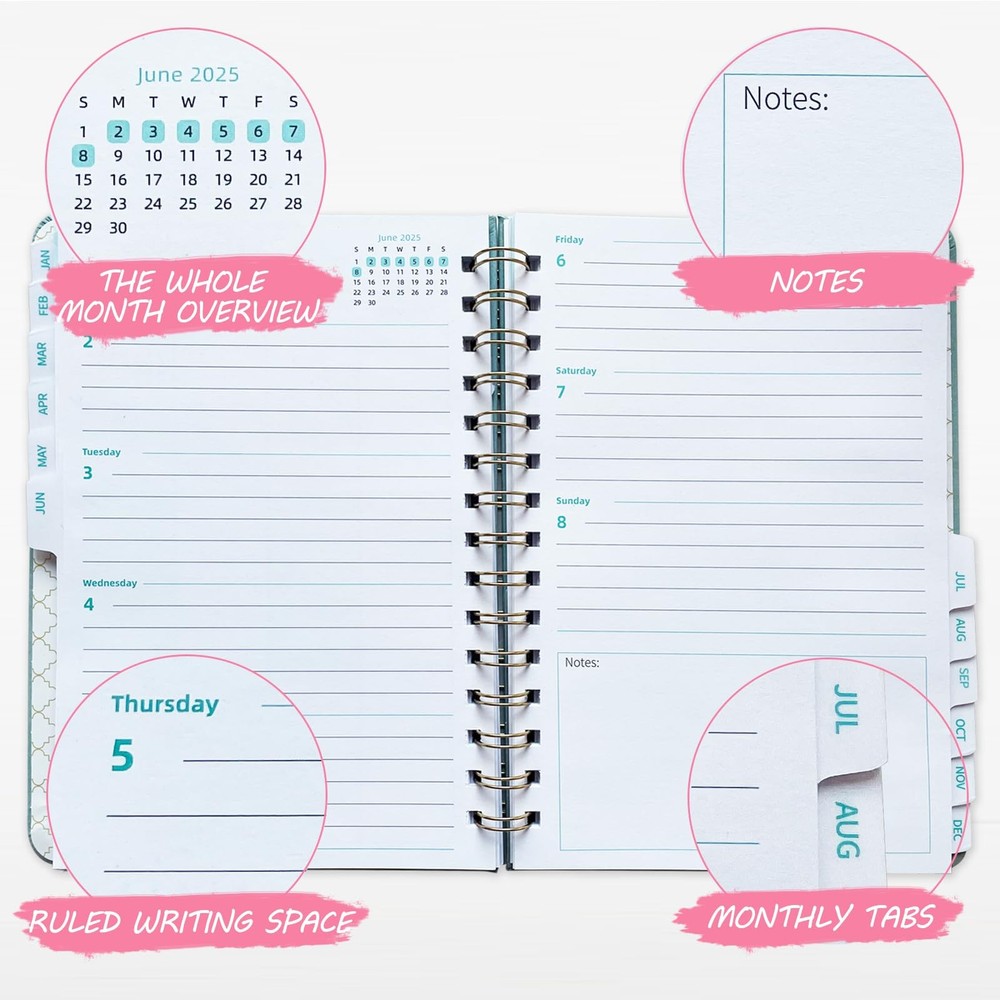 Stay organized and on track with the 2025 Planner Weekly and Monthly Academic Planner. This premium planner covers the entire year from January to December 2025, with daily calendar pages and ample space for notes and appointments. Measuring 6.4" x 8.5", it's a convenient size to carry with you. The twin-wire binding allows it to lay flat, while the tabs make it easy to navigate between months. The faux leather cover in a stylish green hue adds a touch of elegance, and the elastic closure keeps everything secure. An interior pocket provides a handy place to store loose papers or cards. With premium pages and a yearly agenda layout, this planner is the perfect companion for students, professionals, or anyone looking to stay organized in 2025. 2025 Planner Overview: This 2025 planner weekly and monthly is an ideal partner for keeping organised, from Jan 2025 to Dec 2025, 100 gsm premium thick paper, providing a smooth writing experience and preventing ink bleed-through. Size 6.4" x 8.5", easy to carry in a handbag or backpack for on-the-go planning. Soft and smooth skin feeling leather surface makes this 2025 monthly weekly planner notebook more distinctive and premium texture. Perfect for work, school, home Professional Content Design:This 2025 calendar monthly planner is so well organized, its layout corresponds perfectly to all your daily needs, it comes with Quick Reference Information, Calendar 2025 2026 Yearly Overview, UK/US/CA Holidays Reminder, the whole Month Overview, To-Do lists and Notes. With ample space for notes, appointments, and detailed daily planning, this calendar book is a comprehensive planning tool for busy individuals More Practical Functionalities:Monthly Tabs / Inner Pocket / Spiral Bound / Elastic Closure, enhancing usability and organization. High quality and well-made, secure and durable. The spiral planner 2025 perfect as a life day planner, academic planner, school planner 2025, appointment planner, work planner , happy planner 2025, student/teacher planner 2025 or Personal Organiser Convenient Monthly View: Each monthly spread of the 2025 monthly planner contains an overview of the month and a to do list section, offering a comprehensive snapshot of the schedule. Easily plan and prioritize tasks, deadlines, and events with just a glance, Stay organized and inspired throughout Efficient Weekly View:The week is shown using two pages, with each day having enough room to put appointment times, addresses, to-do lists. Note Section for to schedule your week ahead, jot down summary and review of the week