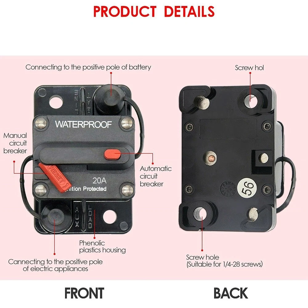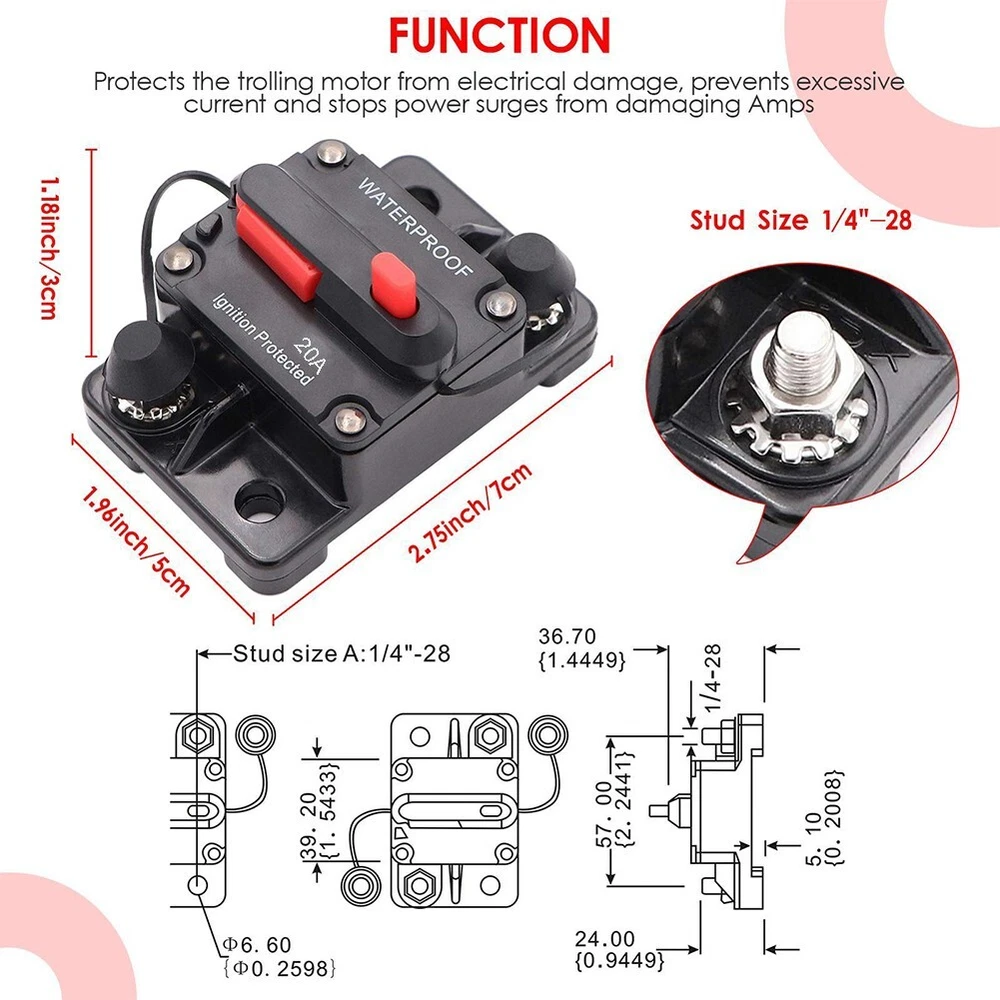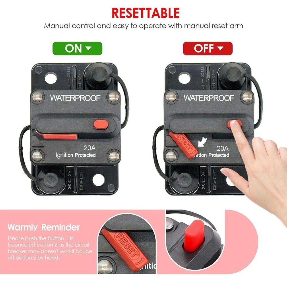 20A Manual Reset Switch Circuit Breaker Holder for Yachts and Marine Vessels DESCRIPTION Features: *20A Circuit Breaker wManual Reset: The visible reset lever indicates the open condition, and the unique push-button reset feature allows it to be used as a kill switch. The button on the circuit breaker can also serve as a master disconnect for circuits. *Breaker fuse holder protects your system: Designed for a wide range of DC system voltages from 12V to 48V, this 20A fuse holder is essential for protecting your system from over-current situations caused by high power draw, short-circuits, wiring mistakes, equipment faults or any other high current event. The mount cover provides isolation, making it splash and dust proof. *Premium material: The screw inside the breaker is made of alloy, efficient conductivity. The housing is made from thermal plastic UL rated 94V0, making it flame retardant. Additionally, it is water-resistant with an IP67 rating. The included waterproof cover further prevents rust on metal parts. *Easy to use: This 20 amp circuit breaker can be used as a direct replacement for an inline fuse holder in DC 12V-48V systems. It can be easily mounted on panels or firewalls for convenient access and usage. *Wide application: The 20 Amp circuit breaker is suitable for auxiliary and accessory circuits in various applications such as boats, marine vessels, RVs, yachts, batteries, trailers, buses, trucks. It can also be used in battery charges and DC sound systems. Specifications: *Product Name:20A Circuit Breaker Holder W/Manual Reset Switch *Material:Plastic+ Alloy *Size:As shown *Color:Black Package Content: 1 x Circuit Breaker Switch Note: 1. The real color of the item may be slightly different from the pictures shown on website caused by many factors such as brightness of your monitor and light brightness. 2. Please allow slight manual measurement deviation for the data. POLICES Shipping Payment WARRANTY We only ship to confirmed ebay Order addresses. Please comfirm that your Order address is in line with your shipping address. Please kindly note that the c ombined shipping is not provided because the shipping fee is calculated by weight. Also, the each additional item means exactly the the same color and size. It takes about 7 -15 working days to US; about 10-30 working days to other countries. Transit time may be a little delayed because of the bad weather and customs inspection . If you do not receive your item within 30 working days since payment finished, please contact us immediately for further assistance. Payment must be completed within 5 days. If you have any problems about payment, please contact us via ebay message. We strive for 100% customer satisfaction! Positive Feedback is very important to us. If you have any questions, p lease feel free to contact us via "Ask seller a question" . We will reply your email within 24 working hours.