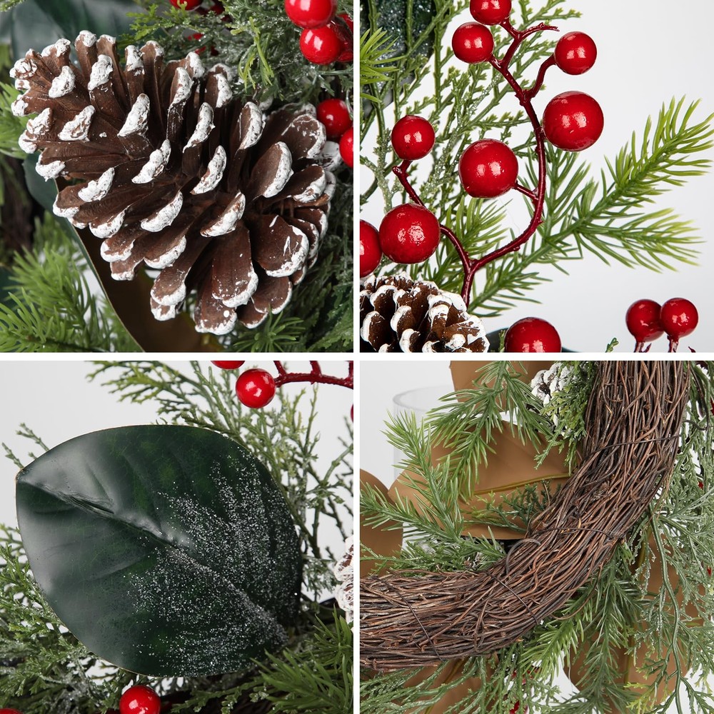 20 Inch Outdoor Lighted Christmas Wreath for Front Door This artificial wreath is an attractive addition for indoor and outdoor decoration, especial for Christmas. Using it can get more festive atmosphere and express your love for life. It will look great in any decor, use this wonderful winter or fall front door wreath for festive fall, winter, and Christmas decorations in your home or covered outdoor locations. Product Specification Quantity: 1 x Christmas Wreath with Light String Elements: Pine Cone / Red Berries / Cypress Leaves / Magnolia Leaves Overall Product Dimensions: 20" Package Dimensions: 13"L x 13"W x 5"H Rattan Base Dimensions: 12" Meterial: Polyethylene / Iron / Foam / Rattan Style: Christmas Decor Notes: The color may exist a slight difference due to different screen displays. For better display, please extend the wreath when you take it out of the box. Please allow a little size difference due to manual measurement. Christmas Ornaments: Welcome to choosing our Christmas wreath! This chic artificial Christmas wreath combines different festive elements and adds a festive atmosphere to your home. Hang the holiday wreath on your front door to warmly welcome visitors and offer them a warm welcome! Classic Xmas Elements: Prelit Christmas wreath is trimmed with flocked pine cones, red berry clusters, magnolia leaves, cypress leaves and LED string lights(batteries not included), features a natural grapevine base. All beautiful Christmas elements create a lively feel to your holiday decor Realistic Artificial Wreath: Constructed with sturdy, high-quality artificial polyethylene materials this hanging wreath decoration is built to bring holiday cheer for year after year. The Christmas wreath with lights is also an elegant festival gift. You can give it as an ideal gift to your relatives and friends to express your blessing and care Festive Decoration: Hang this LED Christmas wreath on the front door, wedding, mantel, staircase, home, wall, window, fireplace, living room, backdrop, mirror, bedroom, dining room, porch to complement both indoor and outdoor decoration and create a uniform festive decoration effect, for an unforgettable Christmas with your family Exquisite Craftsmanship: Treated with the latest pressing technology to prevent elements from falling off the wreath. This winter wreath will retain its original colors and lifelike appearance for years. Note: For better display, please extend the wreath when you take it out of the box