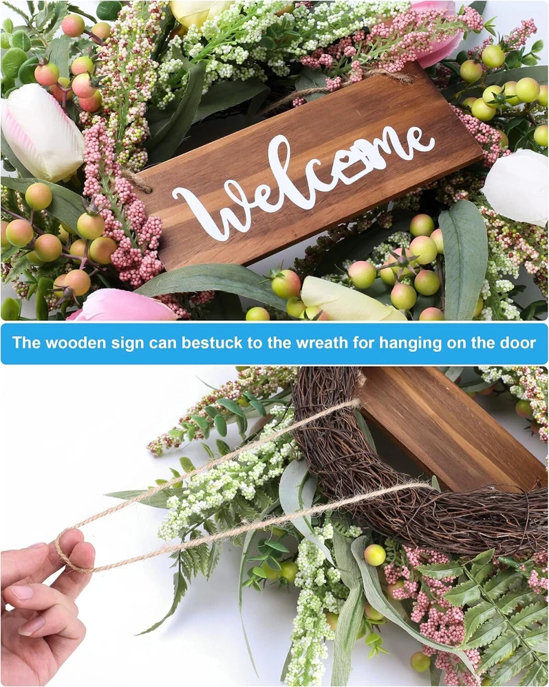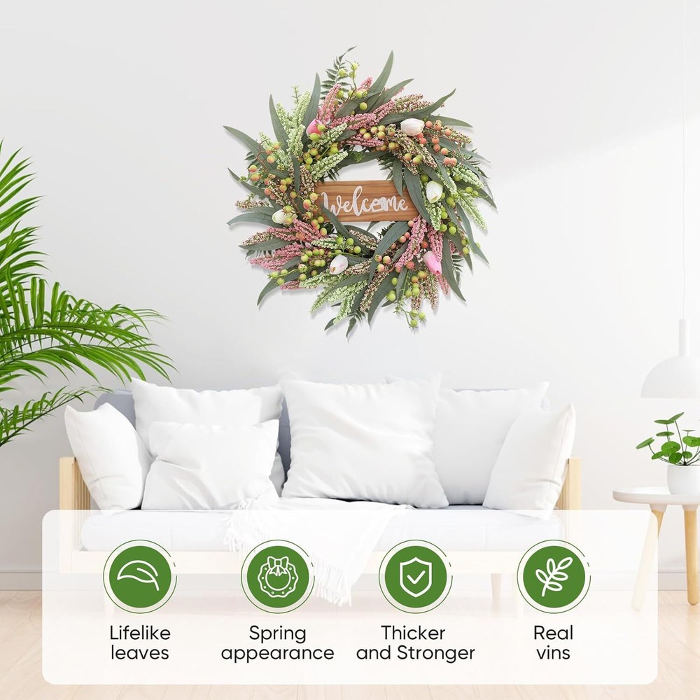 Wreaths for Front Door 20 Inch Tulip Wreath withTulip,Berries,Boxwood and Cattails Welcome Door Wreath, Porch, Window - Green Decor for Home, Farmhouse - Spring, Summer, Fall, All Seasons Item Description About this item 【Full and realistic】 Green eucalyptus leaf wreaths hand - made by Wish Wreaths,features eucalyptus leaves, tulip,green berries, andmany Made from lots of small berries in various colors, these look like cattails embellishedon it, making the wreath full, natural and realistic. Its elegance add a vibrant and pleasant vibe to your home. 【Perfect Size】 This spring wreath is 20 inches in diameter. Each rustic farmhouse eucalyptus wreath is packed in a sturdy and exquisite box, suitable as a gift for friends. Note that because the wreath is compressed by the box to avoid being damaged during delivery, please fully stretch it to reach its maximum size. 【Versatile】 It is suitable for all seasons of the year, spring, summer, fall and winter. You can add elements of each season on it, such as maple leaves, bells, etc. welcome wreaths It comes with a solid wood "welcome" sign. You can use it in cafes, restaurants, malls, and more. And you can DIY it however you like! When you design it yourself, you will find that your wreath is the most unique scenery 【Durable】Made of high-quality materials. Colors will never fade; leaves will never fall; berries will never rot.The base of the front door wreath is made of Anatural grapevine base, which is solid and not prone to falling off, ensuring lasting stability. It can be hung on the wall, front door, porch, bedroom, living room, etc. It is perfect for indoor and outdoor, weddings and parties. It's elegance is sure to impress your family and friends. 【Guarantee】: All our spring wreaths for front door are guaranteed by quality,And every wreath is handmade. If there are any problems with our products, please 【contact us】 at the first time, we will definitely give a perfect answer. › See more product details Payment We accept payment only through PAYPAL Shipping We ship products worldwide through standard express courier service, it will reach within 7 to 10 days to abroad buyers, we ship the product after recieved clear payment and give full information about shipment to the buyer Return We accept product return within 7 to 21 days from delivery date but product should be in original position and not in damaged condition,the return shipping charges will be buyer responsibility